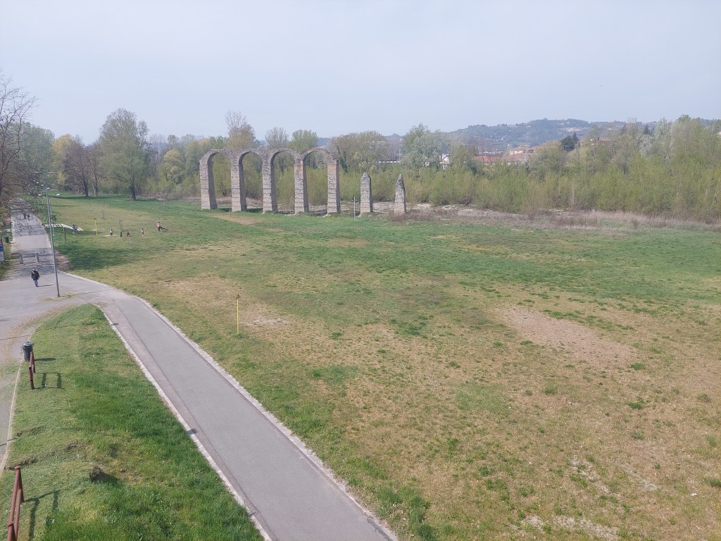 La descente est longue jusqu’à Acqui Terme (tiens pas de h !), petite ville thermale dont les restes de l’aqueduc romain nous accueille. La suite de la route est plate, sur une route à grande circulation, nous roulons sur le bord de la route jusqu’à Alessandria notre destination, il Chiostrio, le cloître, auberge de jeunesse, la personne de l’accueil nous demande notre destination et nous prend en photo devant nos vélos. La ville semble plus pauvre que les localités de la côte, l’habitat à un peu vieilli, mais l’atmosphère italienne est bien là.