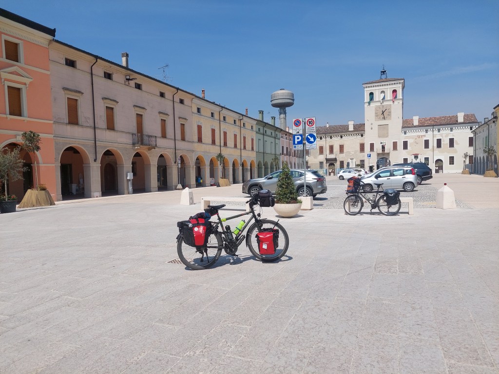 Arrêt repas dans un square à Solarolo petit village en bord de route, quelques cyclistes aussi discutent, puis d’autres m’intriguent en venant remplir des bouteilles auprès d’un distributeur, il s’agit d’une moderne fontaine à eau réfrigérée, par portion de 50 cl, on peut même avoir de l’eau gazeuse (frizzante), ce que me suis permis pour remplir mon bidon.