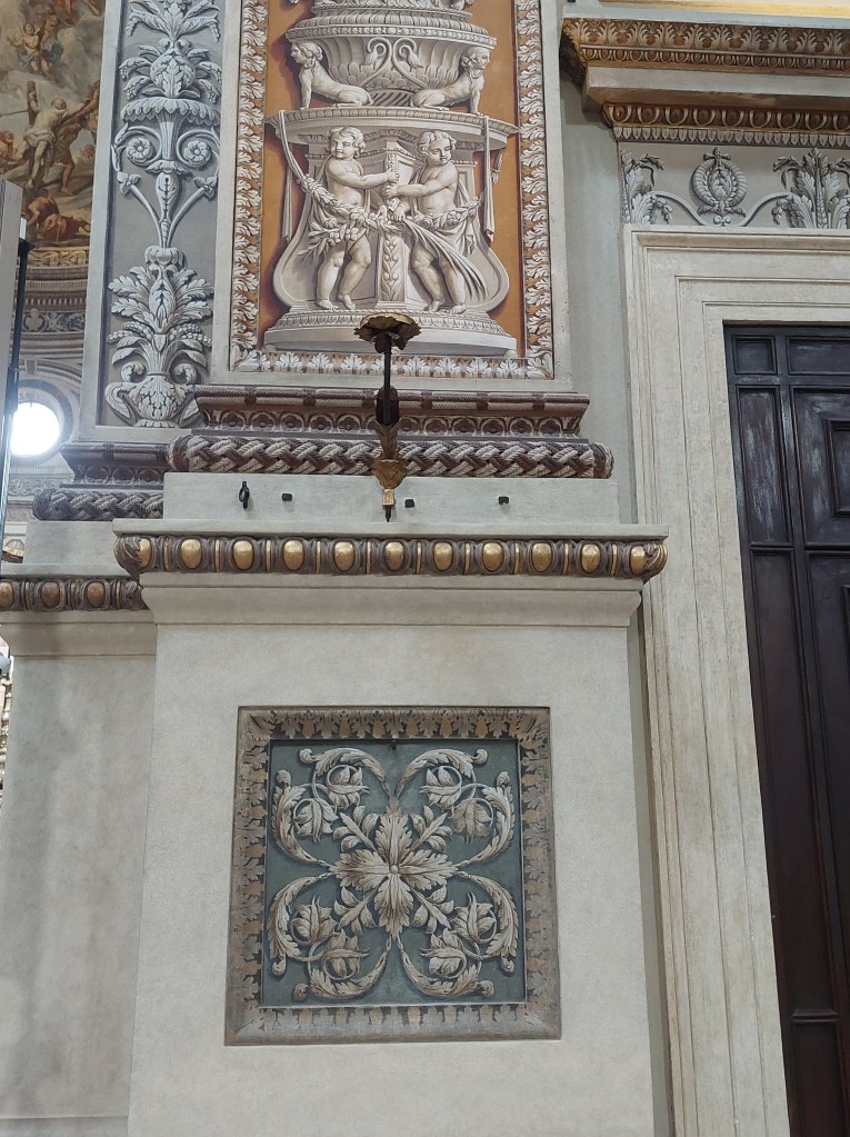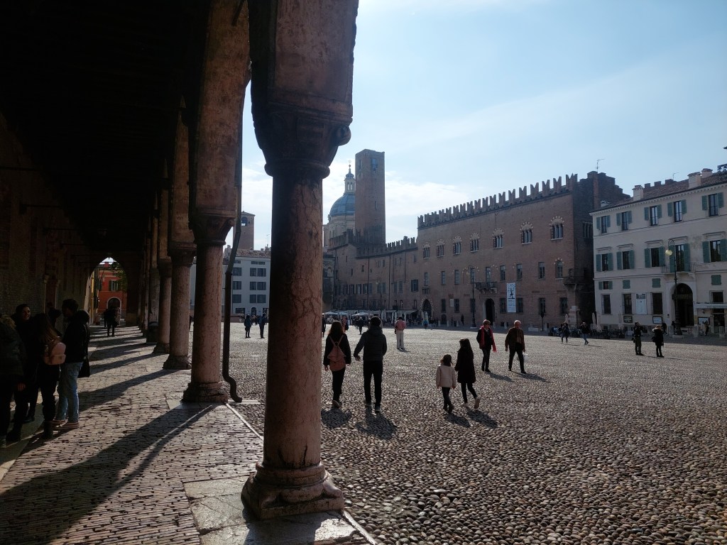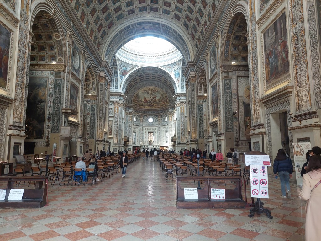 Nous finissons cette longue et plate étape sur des routes avec plus ou moins de circulation pour arriver à Mantova, belle ville riche en monuments et très animée. Nous entrons dans la basilique San Andrea que je prenais pour la cathédrale et qui n’est que concattedrale dit la documentation, grande elle est étonnante dans architecture intérieure, des caissons decorent les voûtes, avec des personnages en trompe-l’œil qui doivent raconter, pour ceux qui conservent une culture religieuse, l’histoire de la bible, j’en resterai à la beauté du dessin sans la signification. Le côté antique à la mode empire de la cathédrale toute proche bien qu’étant plus ancienne ne nous a pas plu. La rotonde San Lorenzo construite au XIème siècle mais surtout restaurée au XXème est remarquable dans son architecture, nous finissons notre visite sous le soleil.