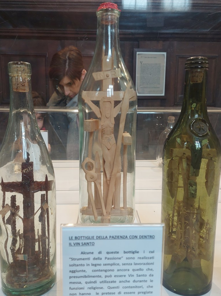 Si je raconte tout ça c’est que nous sommes dans la plaine du Po et qu’il n’y a pas grand changement de paysage, peu à voir et dire. Nois approchonst le fleuve Po qui ne prend pas en Italie d’accent circonflexe ni en plaine ni en eau, c’est un très large pont métallique qui nous invite à traverser le fiume Po, une passerelle métallique nous y est réservée, en roulant sur les plaques ajourées nous produisons autant de bruit que le train de fret ferroviaire voisin. La ville de Cremona n’est pas située sur le Po, mais un peu plus loin certainement à cause des risques d’inondations qui semblent bien improbables en la période mais réels à certains moment. Notre arrivée dans les villes est souvent un peu semblable, nous nous dirigeons vers le centre, devant les piétons nous indiquent la route à suivre, nous sloalomons avec plus ou moins d’élégance et rapidement nous prenons nos velos par la main pour finir à pieds. Mercato ou foire, le centre est gentiment envahi, sans voitures, c’est comme une ville au ralenti, piétons, vélo, c’est animé bien sûr, bavard évidemment, couleurs, parfums d’abord puis odeurs à l’approche des étals alimentaires et autour nous retrouvons le centre ville coloré, murs bigarrés, colonnes, arcades, passages et le soleil du matin qui se fraie discret, un chemin de lumière dans la fraîcheur des venelles. Nous visitons l’église immense, ses dalles de marbre blanches et noires, une icônongraphie picturale nombreuse, figurative, colorée parfois un peu anachronique et pas tragique dans la représentation des personnages, on pourrait presque les prendre pour des scènes de la vie courante.