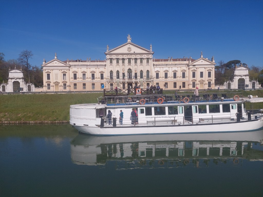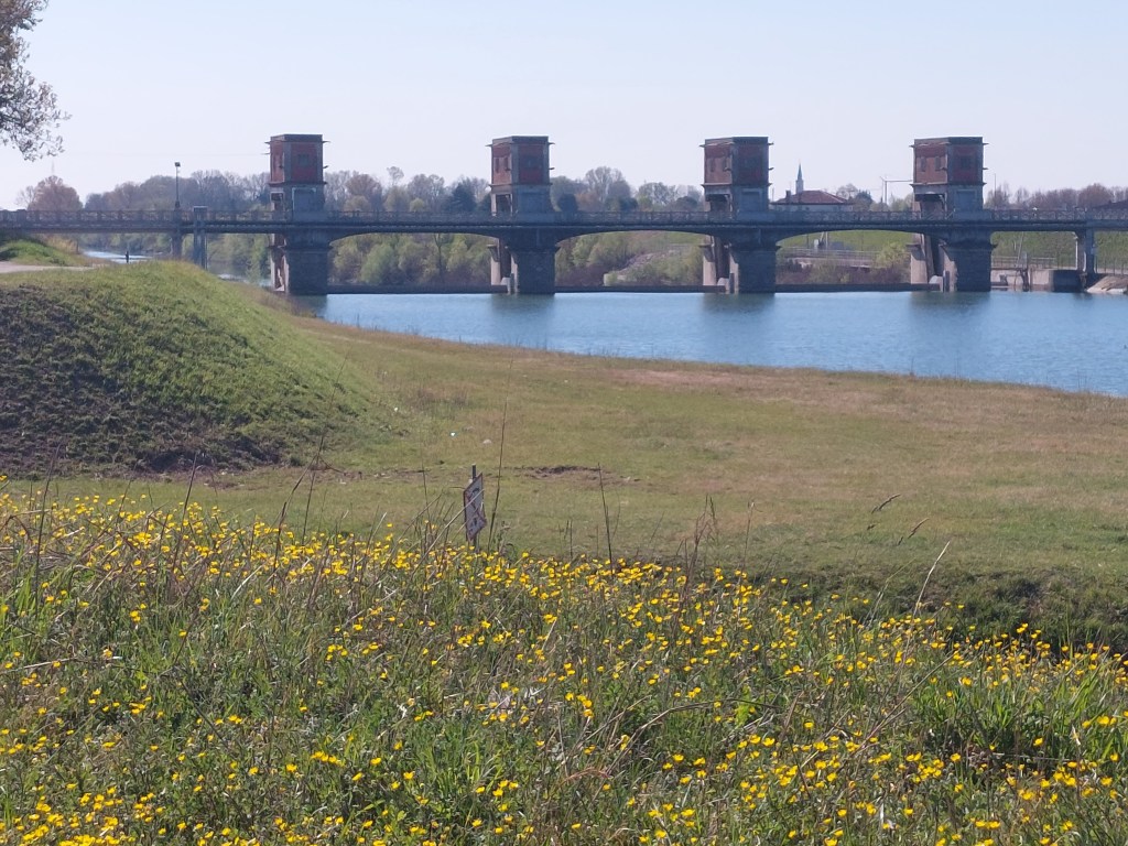 Grasse matinée nous avait intimé notre logeuse, le petit déjeuner, italien disait la fiche du lieu, sera servi à partir de 8 heures, en nous montrant ses 8 puis 10 doigts, c’est donc stoïques que nous avons attendu l’heure dite pour nous présenter devant une table dressée chichement et sur laquelle ne fumait aucune boisson noire emblématique de l’Italie et fait passer de nuit brumeuse à une nouvelle journée où tous les espoirs sont permis, permis que prit Pierre pour dénicher dans la cuisine voisine un bocal de café qui ne servit pas à grand chose sans la cafetière, c’est alors que notre hôte qui nous avait demandé si nous le voulions servi dans une grande ou une petite tasse nous posa la fameuse boisson qui recouvrait à peine le fond du récipient, elle ne revint pas nous proposer un supplément et nous avons commencé à engloutir gâteaux, biscottes et pain fouillant jusqu’aux placards pour satisfaire notre faim, il était tard et nous avions de la route. En fait l’étape était courte et Pierre qui n’aime rien tant que les grandes, fit demi-tour au bout de quelque temps pour revenir à l’hébergement reprendre ses papiers qu’il avait malicieusement laissés sur la table de jardin, fort de cette douzaine de kilomètres supplémentaires il était chaud quand nous avons fini par quitter Padova et c’est alors par la magie d’une allée transversale que la zone industrielle, heureusement déserte ce jour férié, se mua en petite route de bord de canal et tout devint plus doux, des piétons, des cyclistes musardant dans l’air encore frais de ce matin ensoleillé où même les automobilistes respectaient l’allure de chacun sans impatience, tous glissant comme l’eau paressant entre les berges vertes et jaunes de fleurs. La suite du trajet jusqu’à Mestre fut très agréable sur des pistes cyclables un peu sinueuses et parfois même espiègles tant elles se cachent et se dérobent à nos roues.