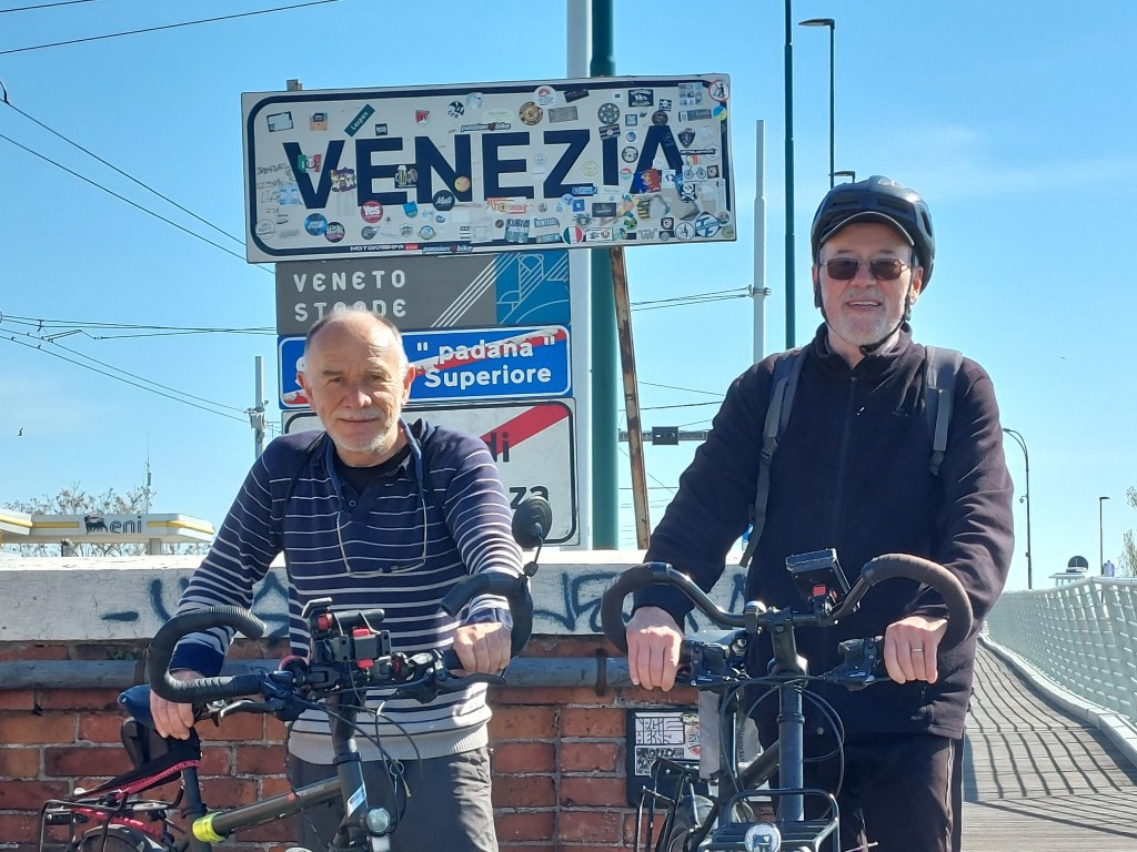Arrivés tôt à l’hôtel nous avons repris les vélos pour leur montrer Venise, chemin tortueux également, il manque du balisage, mais nous finissons par nous faire prendre en photo devant l’entrée de la ville, je trouve un parking vélo, mais à 10 euro le stationnement sécurisé certes nous renonçons et Pierre avise le parking motos à quelques pas, gratuit lui, nous y laissons discrètement nos voyageuses. Tour dans la ville, je retrouve les images d’il y a plus de 40 ans et du monde en plus car il y a foule partout, pas d’agressivité, les flux et flots se croisent, les musiques des langues du monde se mélangent joyeusement, les selfies se retournent sur deux visages heureux, des smarphones braquent leurs lentilles vers les monuments, palais, ponts, gondoles qui font le spectacle, le commerce n’est jamais bien loin, boutiques qui rendent à la rue les élégantes aux bras chargés de sacs siglés, étalage de vêtements marqués Venise ou San Marco, échoppes de glaces (gelato ! ) ravies de ce printemps ensoleillé, vitrines de babioles en tour genre, tout deviendra souvenir, puisque c’est ce qu’on vient chercher.