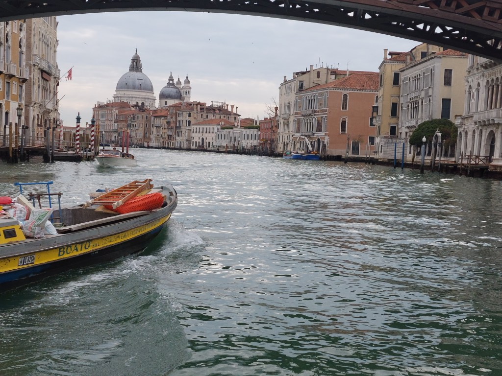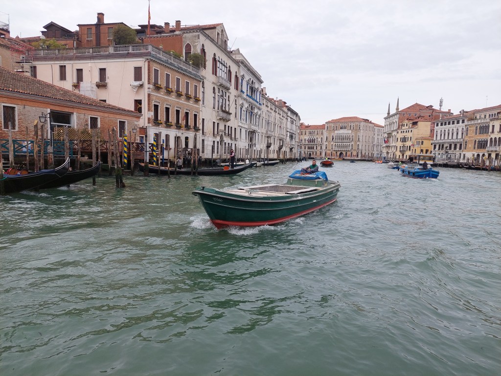 Nous voyons maintenant l’Adriatique, protégés par la lagune, nous goûtons notre premier jour de repos sans les vélos sagement stationnés derrière le salon du bar de l’hôtel, après cette agréable traversée de l’Italie, la journée est consacrée à Venise. Incapable de trouver les horaires de bus à l’arrêt proche et sur le site Internet de la société de transport locale, c’est Google qui s’y colle et me donne l’heure de départ et d’arrivée du bus qui doit nous mener à la piazzale Roma. Forts du sésame acquis en prévision la veille nous nous postons sur la rue, malgré tout un peu anxieux et au bout de quelques minutes, la conductrice nous accueille d’un « Buongiorno » chantant, nous verrons que les passagers sont essentiellement des travailleurs se rendant à Venise s’occuper du touriste, on se connait, on est en famille et au terminus la conductrice souhaite « une bonne journée tout le monde » chaleureux, une belle journée qui commence. Réjoui par la musique si spécifique de la langue, je me rêve à imaginer un programme d’apprentissage de langue vivant, au lieu de commencer par les verbes irréguliers ou les déclinaisons qui ne servent plus beaucoup le mauvais élève que j’avoue avoir été, vous me ferez 10 minutes de Umberto Tozzi, puis 10 minutes de Janis Joplin, à reprendre en choeur. Premier accès au vaporetto, notre pass transport tout neuf est refusé, nous avons malencontreusement pris la file travailleurs locaux, aidés par l’employée compatissante nous rectifions pour ce premier voyage sur l’eau et c’est beau Venise, cette ville flottante, chaque façade léchée par la mer est œuvre d’art, des colonnes, des sculptures, des portes ouvertes sur le canal, une décoration que j’imagine derrière ces fenêtres ouvragées et muettes. Cette cité baroque, quelle histoire raconte-t-elle de ses créateurs et constructeurs, quelle mémoire retient elle des époques passées et quelle vie aujourd’hui derrière ces murs, j’en suis émerveillé.