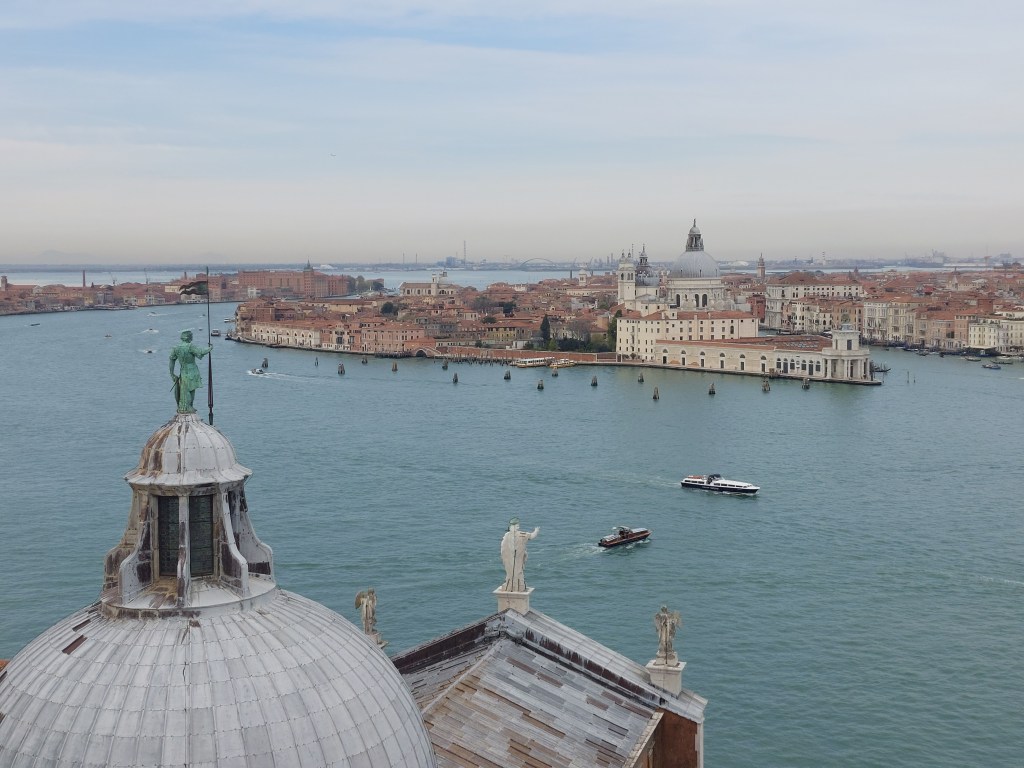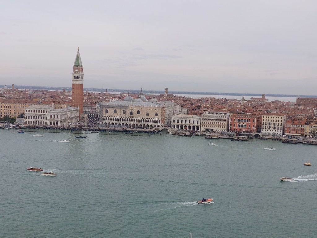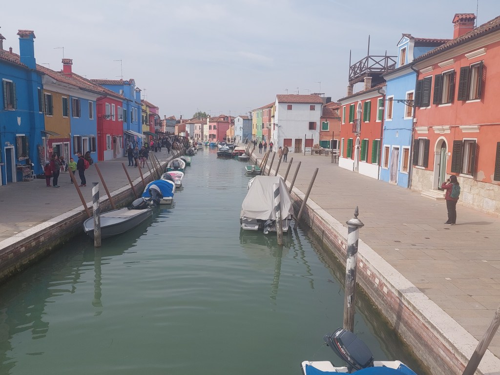 Mauvais élève toujours, je n’ai pas préparé la journée et malgré l’heure matinale, il y a foule près de la basilique San Marco, devant l’entrée à 6 euros, je flashe le code et pas de place pour ce jour, pas mieux à l’entrée à 12 euros, nous tentons sans grande conviction l’entrée gratuite, elle est comme hier gratuite, mais interdite, pas plus de chance au palais des doges, qui me dit que je peux avoir une réduction si je m’y prends 30 jours à l’avance, pas vraiment à l’aise dans les files d’attente nous renonçons et décidons de rejoindre l’île de San Giorgio en vaporetto dont nous commençons à maîtriser les codes. La courte traversée nous mène près du Saint et son inévitable église, ouverte et gratuite et montons au campanile pour découvrir le magnifique panorama de la ville, c’est superbe et nous sommes quasiment seuls, le bonheur. Retour sur Venise, nous déambulons vers des zones un peu plus calmes, moins touristiques, telles que nous avaient fait découvrir deux amis chers à Cerise et moi, il y a 40 ans, Emmanuel était alors en germe et c’est lui qui aujourd’hui m’a aidé à faire germer ce blog. Dans ces quartiers périphériques, les façades sont plus simples, du linge sèche aux fenêtres, de « vrais » gens vivent dans ces habitations, dont le crépis s’efface devant la brique, nous croisons même de « vrais » magasins, boucherie, poissonnerie, une autre atmosphère, le soleil légèrement voilé dépose un peu de nebulosité sur la ville et ça lui va bien ce filtre qui la rend un peu mystérieuse. Après le repas en terrasse, nous reprennons le vaporetto, direction l’île de Burano, via punta sabbioni presqu’île de la lagune, c’est aussi dans l’alignement celle-ci que dont installées les vannes censées protéger Venise des fureurs de la mer. Après les maisons vivement peintes de Burano, n’ayant pas trop envie de nous mêler à la foule, nous reprenons le chemin de Venise, parcourons quelques petites rues et finissons par déguster en terrasse le fameux spritz à l’aperol dont la couleur orange me tente depuis l’arrivée. Une belle journée, je ne voudrais pas que Venise disparaisse et comment préserver ce joyau ?