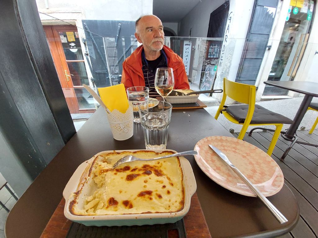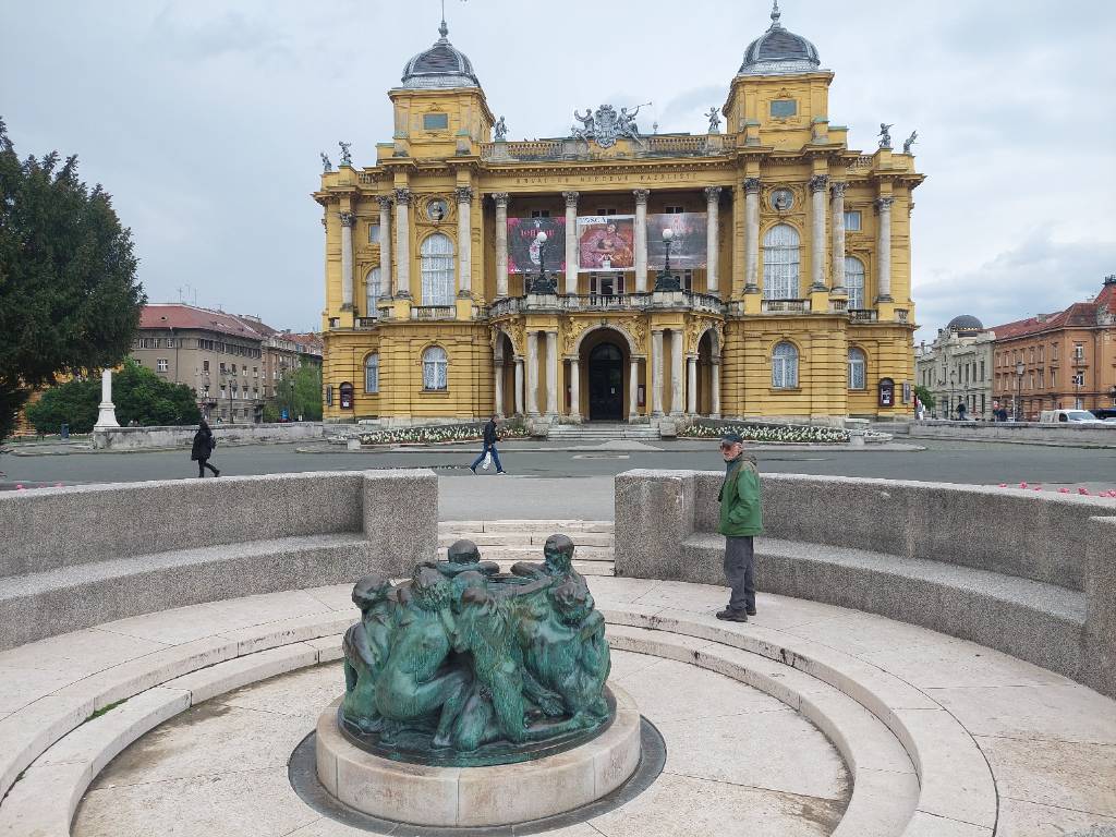Aujourd’hui, jour de repos, nous avons prévu de poirsuivre la visite de Zagreb, nous sommes logés dans le centre et muni du plan nous partons sillonner la ville et surtout sa partie historique et touristique. Départ vers la gare toute proche, sentir l’odeur du voyage, puis le jardin botanique parenthèse verte dans la ville, ce n’est pas la seule, il y a du vert et l’espace ne manque pas, la seule contrainte est de … respecter le code de la route, ne pas traverser les rues tant que le feu n’est pas vert, ni en dehors des passages piétons et fort de ce principe là balade est agréable. Le sentiment général est que la ville est aérée, les rues sont larges, des trams de toute époque parcourent la ville en tous sens. L’architecture est dans style que je qualifierais de neoclassique baroque, sans être du tout sûr de mon avis, il y a des influences byzantine, slave orthodoxe, grecque mythologique etc. et pas de signe de « soviétisme de style stalinien », il est vrai que nous sommes dans le centre. Nous poursuivons par les archives de l’état croate, un bâtiment un peu art déco, dont nous apercevrons le riche intérieur fermé à cette heure, le musée des arts et métiers, architecture classique, en jaune comme quelques autres, en travaux car bien abîmé, danq cette partie, ville basse, les bâtiments sont imposants. Devant le théâtre National Croate la fontaine de la vie, sculpture où chacun doit trouver sa symbolique, j’y plonge ma main, l’eau est source de vie, pensons y. Nous passons dans la ville haute partie la plus ancienne, les rues sont plus étroites, pavées souvent, des escaliers et passages relient aussi les différentes parties, sont également en réfection et inaccessibles la cathédrale avec ses deux flèches, l’église Saint Marc ses toits vernissés et colorés, nous longeons un côté du palais presidentiel proche, entourée de barrières le devant est fermé aux passants. Nous traversons le marché aux fleurs, puis le marché alimentaire, essentiellement des légumes et des fruits présentés sur des étals en bois fixés au sol et partout des échafaudages, des grues pour embellir et conserver le cachet de la ville historique. Sur les conseils de Pierre nous allons dans un restaurant situé dans une rue en pente, déguster un plat traditionnel croate le Štrukli, en terrasse, c’est une jeune Française qui nous sert, vu mon pauvre anglais, que beaucoup de Croates pratiquent avec aisance, ses collègues lui ont certainement dit d’aller s’occuper de nous, ce qui nous facilite le choix et très bon choix ce restaurant.