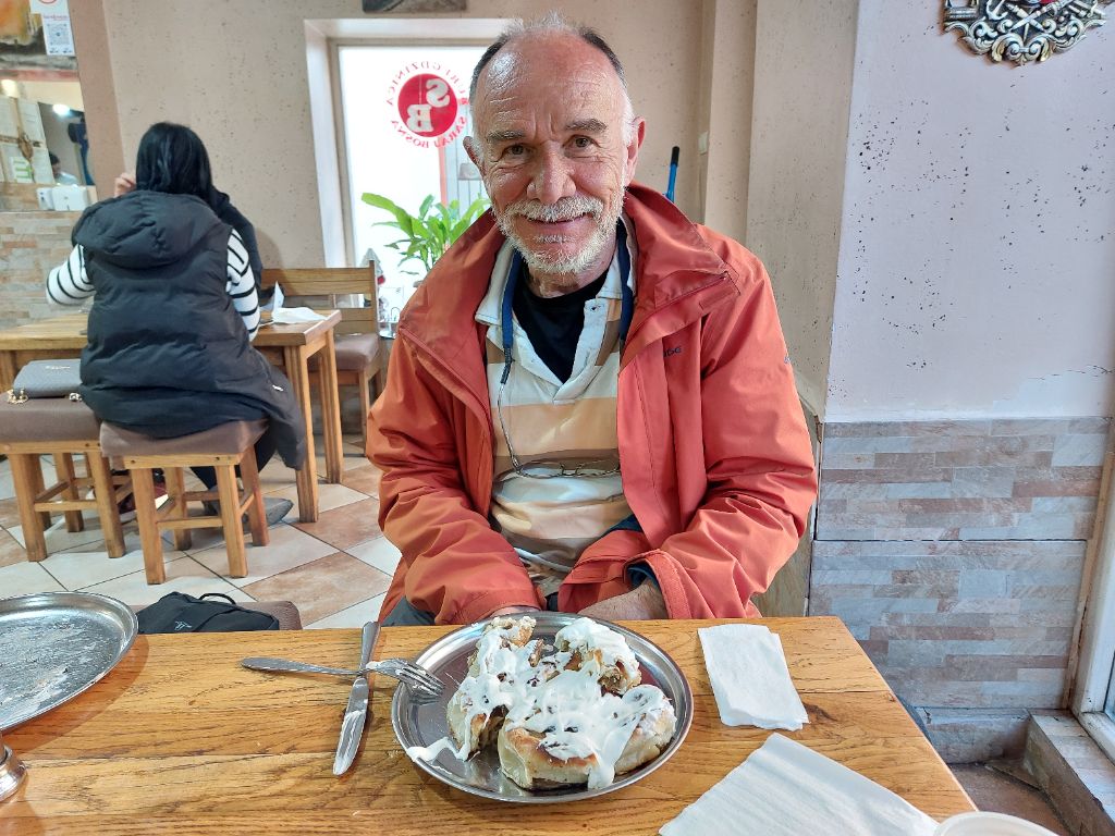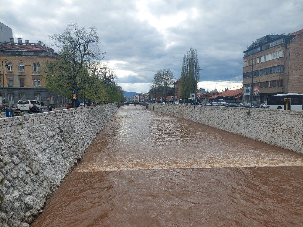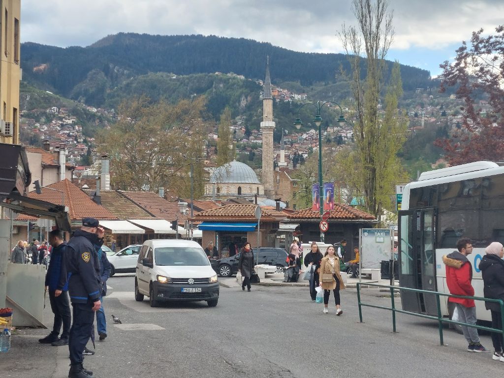 Un peu plus chaudement couverts pour la descente, parce nous sommes revenus vers l’hiver ses arbres encore sans feuilles, nous repartons sous la pluie et le froid, après quelques kilomètres nous sillonnons un plateau de montagne, sous un pâle soleil intermittent les nuages font place à de la vapeur qui tente de sécher les aiguilles des sapins, trouée dans la montagne, des espaces enherbés, quelques habitations, certaines de bois, vie simple et rude, quelques traces de tourisme, ni la présence humaine ni la route n’ont qemble-til défiguré la montagne, le tout prend une place permettant de profiter du panorama dans lequel nous devrions être juste tolérés, je m’invite entre montagne et forêt, je goûte ces moments, la pente est modérée, la circulation est paisible. Durant la descente, en bord de route, l’eau du ruisseau gonflé des pluies de la nuit est rouge, argile ou résidus de l’extraction de bauxite, nous l’ignorons et cette couleur nous suivra jusqu’à Sarajevo où coule la Miljacka, les bords de route sont jonchés se détritus jetésdepuis les véhicules, c’est bien triste. Après une ascension un peu raide, nous descendons vers Sarajevo, ville tout à fait particulière, cosmopolite, multi-religieuse, presque orientale, nous arrivons dans un nouveau monde. Logés au cœur de la ville, nous parcourons ce qui s’apparente à un souk dans sa forme, souk pour touristes avec ses magasins (bijoux, cuir, dinanderie …), nous y mangeons des bureg, feuilletté fourré (épinard, fromage, viande) cuit sur la braise. Sarajevo, bien entendu, je pense au siège qui dura plus de 3 années, on n’en verra pas les traces 30 ans plus tard, un musée mémorial est installé dans la ville, que la paix se déploie dans ce pays. Depuis ce matin j’ai un air dans la tête, ce sont les quatre saisons de Sarajevo de Gérard Delahaye, une chanson pour « enfants », tout en délicatesse et optimisme :