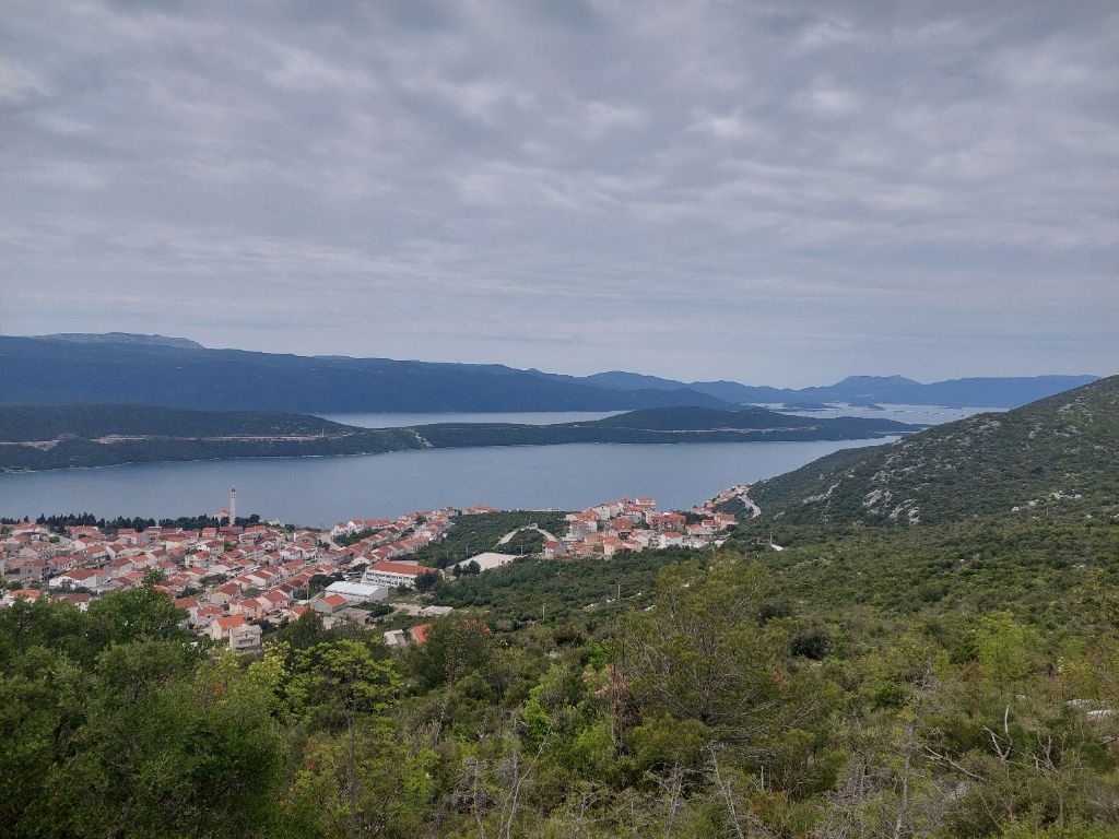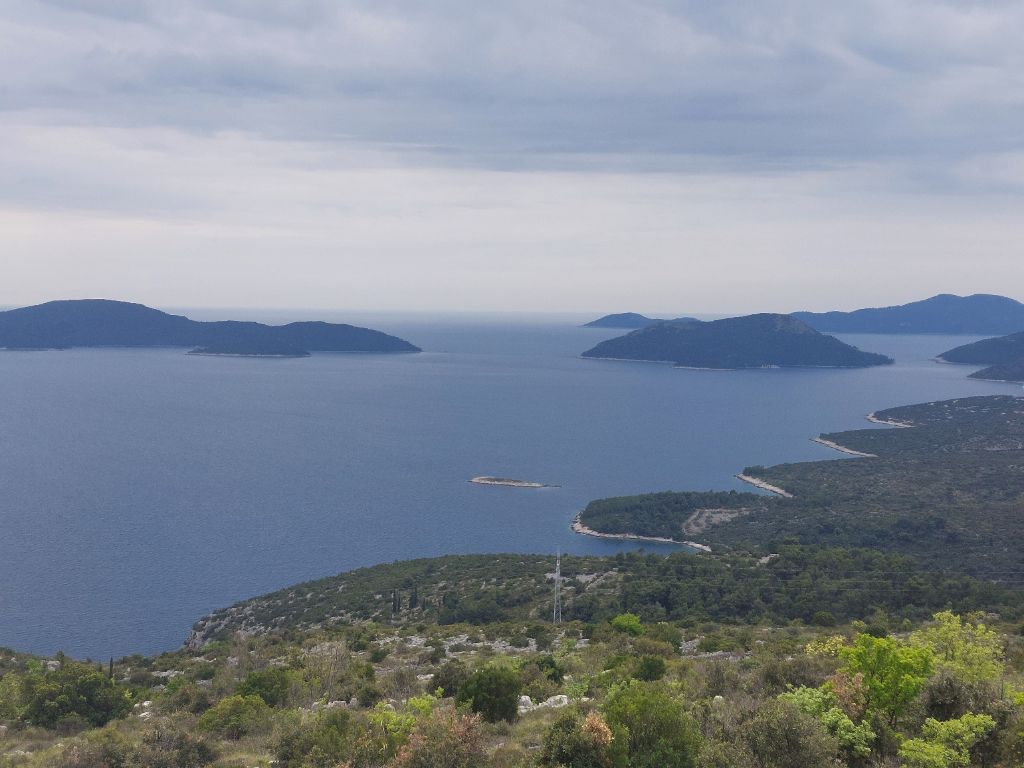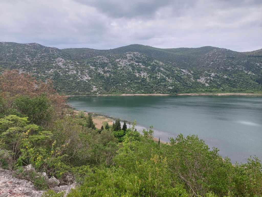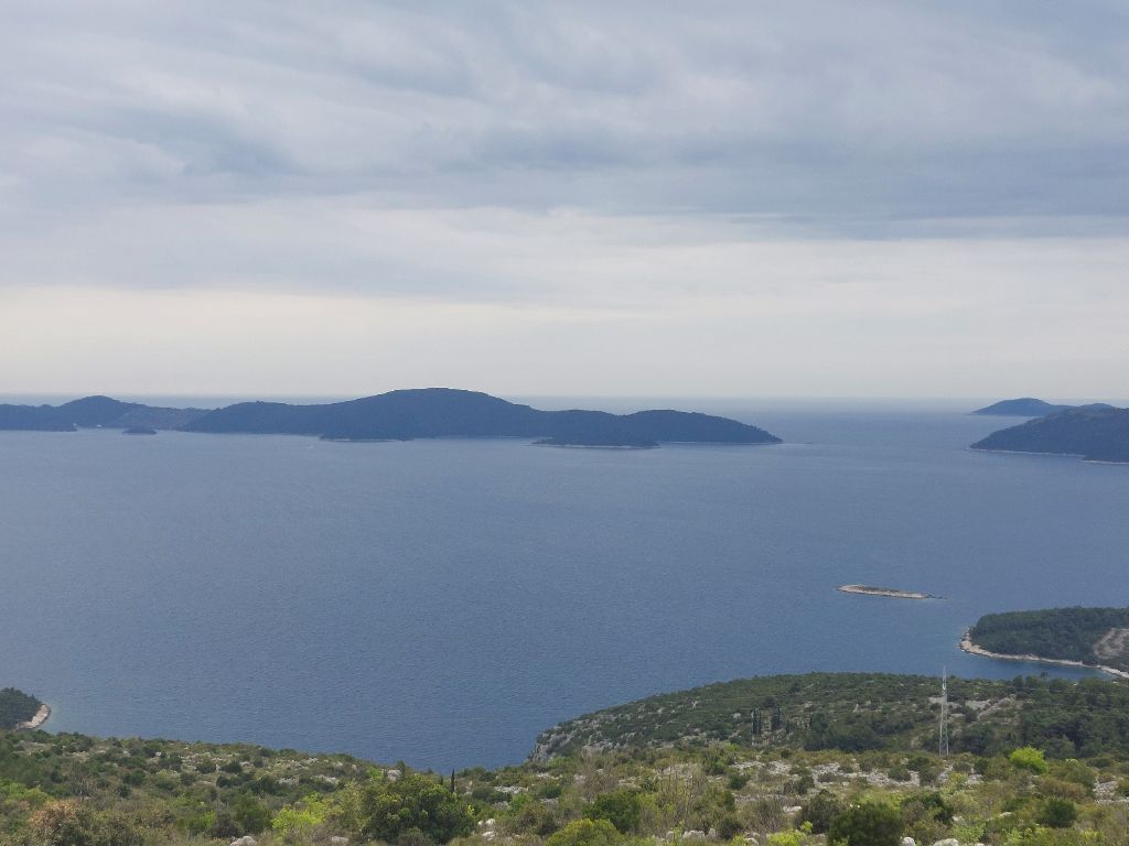 Matin un peu gris, pas de pluie annoncée, ce sera la météo du jour, nous prenons le petit déjeuner dehors sur les tables extérieures à l’hébergement. Départ matinal, nous reprenons le chemin inverse pour retrouver notre route, un grand espace fermé est interdit, présence de mines indiquent plusieurs panneaux, peut être un terrain d’entraînement militaire pour ce pays dont les éléments guerriers n’ont pas totalement disparu, quelquefois des hommes en treillis, des affichettes devant les magasins interdisant l’entrée avec arme. Après avoir passé les chaussées défoncées pour cause de travaux, nous roulons dans la vallée élargie de la Neretva, le chemin d’exploitation agricole caillouteux épouse le cheminement d’un canal d’irrigation qui arrose les plantations, vignes, oliviers, légumes, fraises, quelques véhicules accèdent aux parcelles, nous ne sommes pas dérangés, juste bien secoués. Nous quittons la Bosnie-Herzégovine pour y revenir plus tard dans ce minuscule accès à la mer, enserré dans la Croatie à Neum, plusieurs passages de frontières, je m’y perds, mais il suffit de donner mon passeport si on me le demande. Nous laissons le delta de la Neretva pour grimper par une étroite route déserte un peu raide, c’est le matin ça monte bien, je suis rapidement chaud et humide, j’aperçois le bord de mer, nous allons le suivre jusqu’à l’arrivée. Rejoignant le grande route, j’ai d’abord l’impression d’être dans un fjord formé par la falaise côté terre et de hauts massifs boisés de l’autre côté du bras de mer, je découvre plus tard que ce sont des îles toute en longueur sur plusieurs kilomètres, on y voit des pêcheurs, des espaces de pisciculture et de mytiliculture, c’est en s’élevant que la configuration spécifique du panorama s’affiche, nous sillonnons la véloroute balisée sur l’ancienne voie reliant Dubrovnik, le point de vue est superbe, en haut c’est un paysage de causses, je sens l’odeur du serpolet, la lavande est abondante. Nouvelle descente vers la mer puis on s’élève à nouveau, altitude maximale 410 mètres, juste quelques voitures, ça vaut la peine et c’est bien plus sympathique que la route qui longe le mer que nous finissons par emprunter 20 kilomètres avant Dubrovnik, grande ville touristique, le yacht y est abondant et navigue dans la baie.