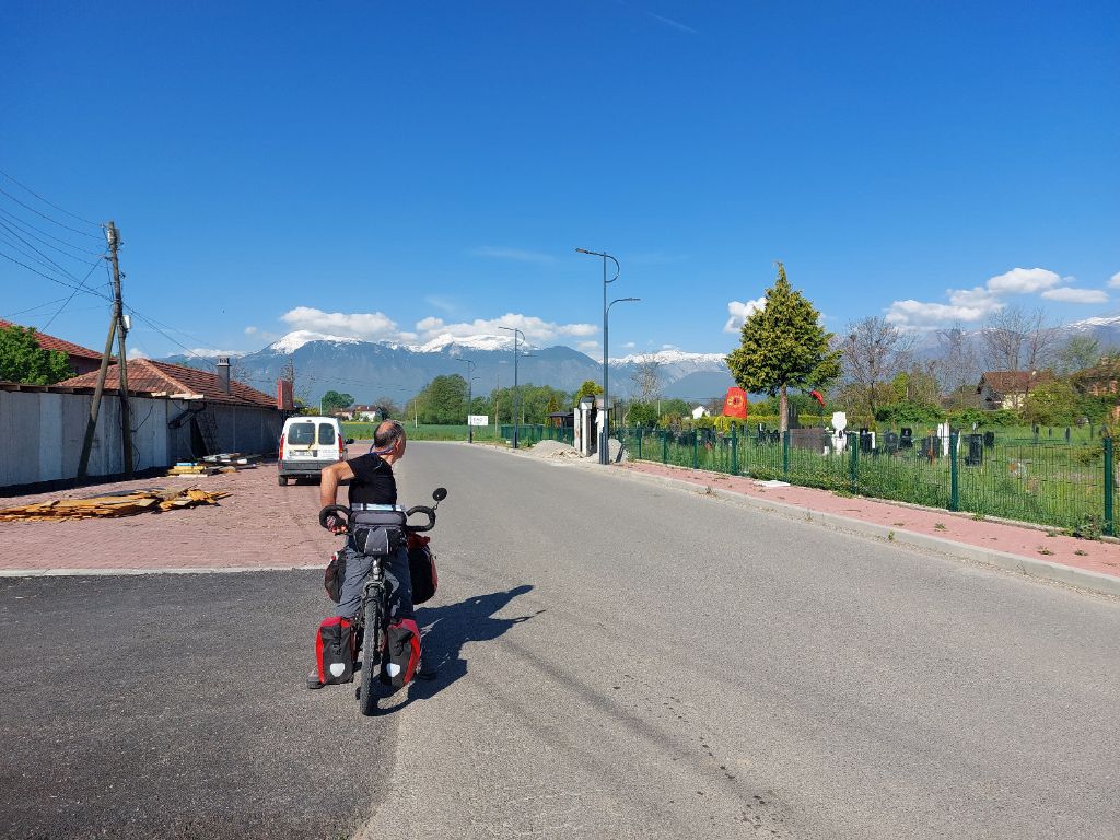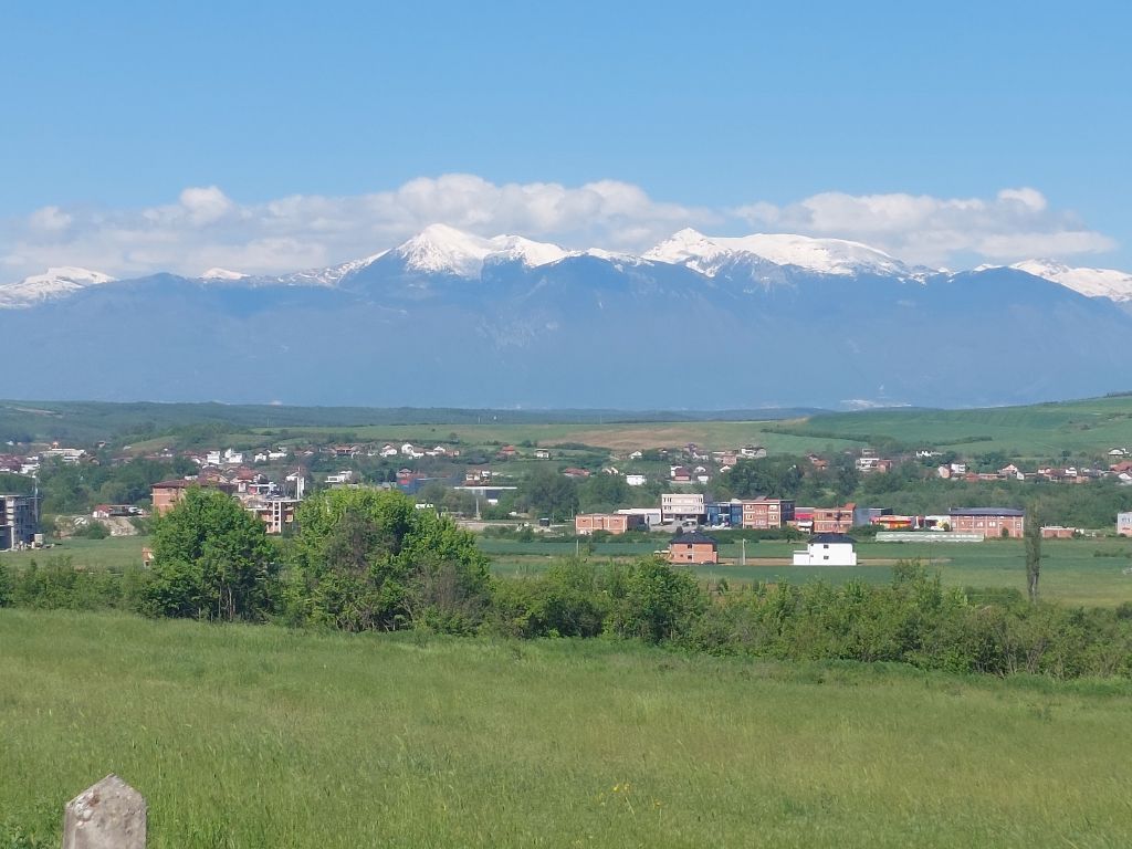 Vapeurs d’essence, la ville se bouge, le soleil l’a activée, nous tournons le dos à la montagne, de temps en temps, tourner la tête vers les sommets, meringue immaculée, chercher sur le versant la petite couture sinueuse qui nous a conduits ici, nous y étions hier, quels souvenirs, la vue, le plaisir de traverser ces espaces adoucit la difficulté de l’ascension. Sortis de la ville, nous roulons au milieu de la campagne, des maisons, neuves, inachevées, abandonnées, hameaux, des églises, catholiques, à Pejë nous avions vu des mosquées. Dans les villes et villages, rues en travaux, ornières, c’est la reconstruction, boucher les trous permettra t-il de refermer les plaies. Après ces kilomètres sans bruit, le rugissement de la route me surprend, le bas-côté est un fragile, instable et étroit abri pour se protéger du flux automobile, enfin nous retrouvons des routes plus tranquilles, hauts murs, portails hermétiques immenses enserrent les habitations, nombreuses tombes, monuments, mémorial de bord de route, cette région a-t-elle plus souffert. Nous voyons à nouveau des sommets face à nous, le Kosovo en est entouré, la route est longue, pas très agréable aujourd’hui, immanquablement je repense à la guerre qui crée ou raye un pays de la carte, que de peines pour une capitale, combien de morts, d’invalides, de larmes avant l’arrêt des hostilités, existe t-il un quota avant de hisser un bout de tissu au bout d’un mât, « un étendard des étendus, ami t’ai je bien descendu » chantait Pascal Mathieu. Arrivée tortueuse à Pristina, petites ruelles pavées et en forte pente dans la vielle ville où se situe notre hébergement, une auberge de jeunesse, très bon accueil, cadre sympathique, nous irons dans la ville à la tombée de la nuit, beaucoup de monde dans les rues, nombreux magasins ouverts, pas de stress, la guerre est loin, tant mieux.