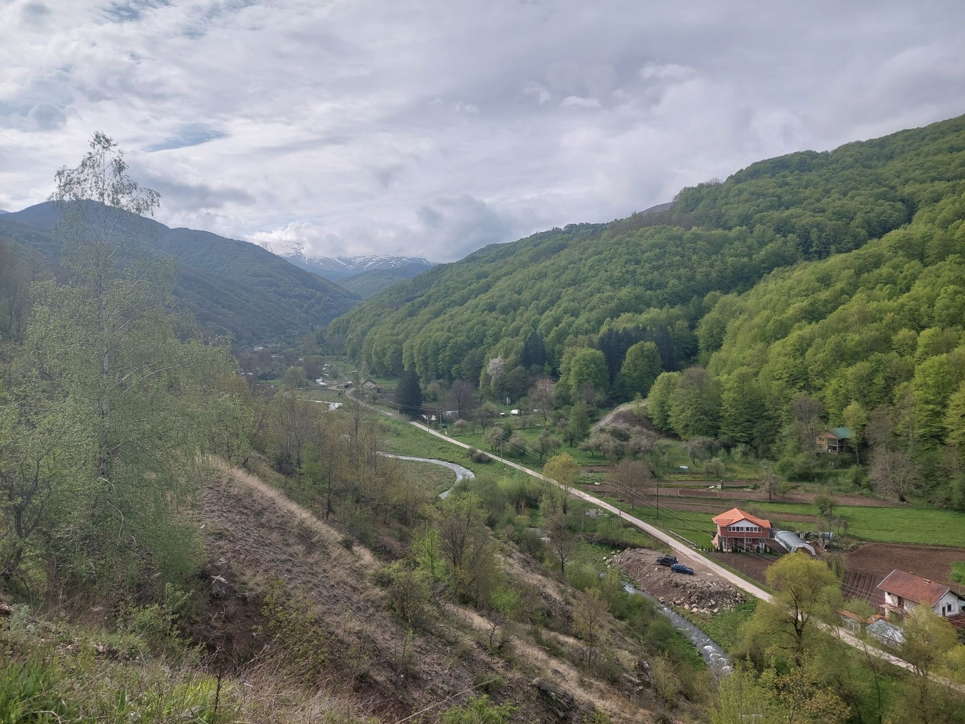 Après avoir descendu la côte escaladée hier, nous avons repris l’ascension qui doit nous mener vers la Bulgarie et le col qui la sépare de la Macédoine, nous partons su fond de vallée, espace que je trouve un peu triste par manque de soleil et absence de perspective, la montée de 500 mètres environ varie de 5 à 7%, soit une vitesse qui, pour moi, fluctue entre 7 et 5 kmh, j’ai le temps de voir le paysage et les travaux qui ponctuent le trajet, la route est élargie et des ponts remplacés, nous ne sommes pas gênés par le trafic, ni par le vent qui soufflait ce matin, avantage de la grimpe. Frontière pas surchargée non plus, en attendant je vois les d’hirondelles virevolter autour des barrières et rejoindre leurs nids collés aux bâtiments, passeport permanent pour elles, rien à déclarer, pourquoi l’homme se limite-t-il ? Passage en Bulgarie, vallée ouverte, nous voyons loin et ça descend, la route est droite et le restera longtemps, la circulation est plus importante pour devenir gênante à cause de la vitesse et des dépassements qui nous surprennent ce qui ne change pas de ce dont nous avons l’habitude hélas. La fin sera plus difficile, la pluie commence à tomber, beaucoup de trafic, du vent fort, je peine en côte. Arrivés à Doupnitsa, nous ne trouvons pas l’hôtel à l’adresse indiquée, certes c’est du cyrillique, mais la réservation se trouve en fait à plusieurs kilomètres dans la montagne, desservie par un mauvais chemin, erreur manifeste, nous irons dans le centre de Doupnitsa pour ce soir.