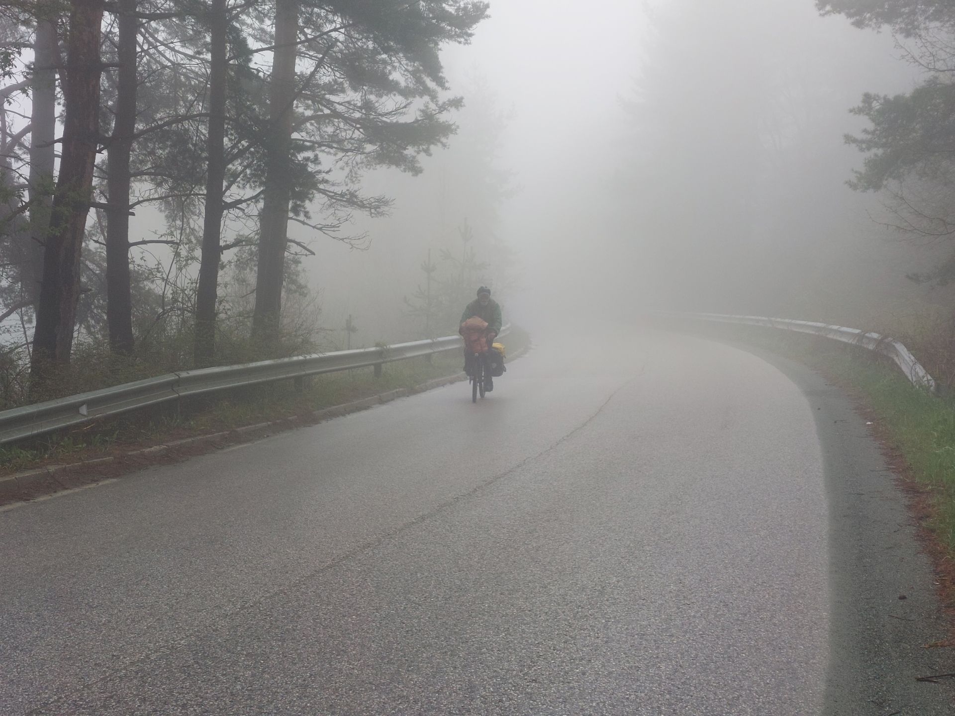 Sortie de l’hôtel vers 8 heures locales (une heure de décalage avec la France maintenant), après une nuit réparatrice et un solide petit déjeuner dit continental selon la carte, la route est rectiligne, c’est un faux plat, qui avec le vent de face se transforme en vrai côte pour le cycliste amateur, seules quelques haies conservées nous préservent un peu du souffle froid et humide. Le paysage est morne et plan, quelques champs sont cultivés et souvent les terres semblent inoccupées, la forêt semble renaître dans les montagnes qui entourent la vallée, il n’y a personne en dehors de la route, c’est déjà ce qui m’avait étonné en Macédoine, des champs enherbés, pas d’animaux, pas d’habitations et pas d’engins agricoles, le pays se dépeuple notamment dans les campagnes. Nous voyons de loin un grand espace gris qui s’avère être un vaste champ de panneaux solaires installés sur une pente, ce n’est pas aujourd’hui qu’il produira de l’électricité, ce n’est pas très beau, mais beaucoup moins polluant que la centrale à charbon qui nous a accueillis la veille, mode de production majoritaire dans les Balkans. La montée du premier col s’annonce, je me mets en mode garde ton énergie pour la suite en suivant la roue de Pierre qui ménage mes forces, ce qui fait que tête ne harcèle pas jambes qui font le boulot. Comme il y a quelques véhicules qui me doublent, je me demande si je ne pourrais pas leur revendre quelques crédits carbone que j’accumule en pédalant, à la manière des voyageurs aériens qui gagnent des miles chez Air France, en voilà une idée à creuser. Arrivés au col, petite pause, nous ne trainons pas vu le froid et repartons en nous couvrant un peu, le temps ne s’améliore pas, je remets des gants pour la descente et c’est à nouveau la campagne vide et peu peuplée, nous nous arrêtons dans un restaurant de village, mais n’ayant pas encore de monnaie locale, ils ne peuvent pas nous servir, nous qui quittons à regret la salle chaude pour sortir nos provisions dans la terrasse fermée un peu à l’abri. Ragaillardis, nous attaquons le second col, le brouillard s’épaissit, je ne distingue pas grand chose du paysage, les bruits sont feutrés, seules les jambes savent que ça monte. C’est en descente que nous atteignons Sofia, la capitale où nous resterons une journée, un peu de repos ne me fera pas de mal après ces journées bien chargées.