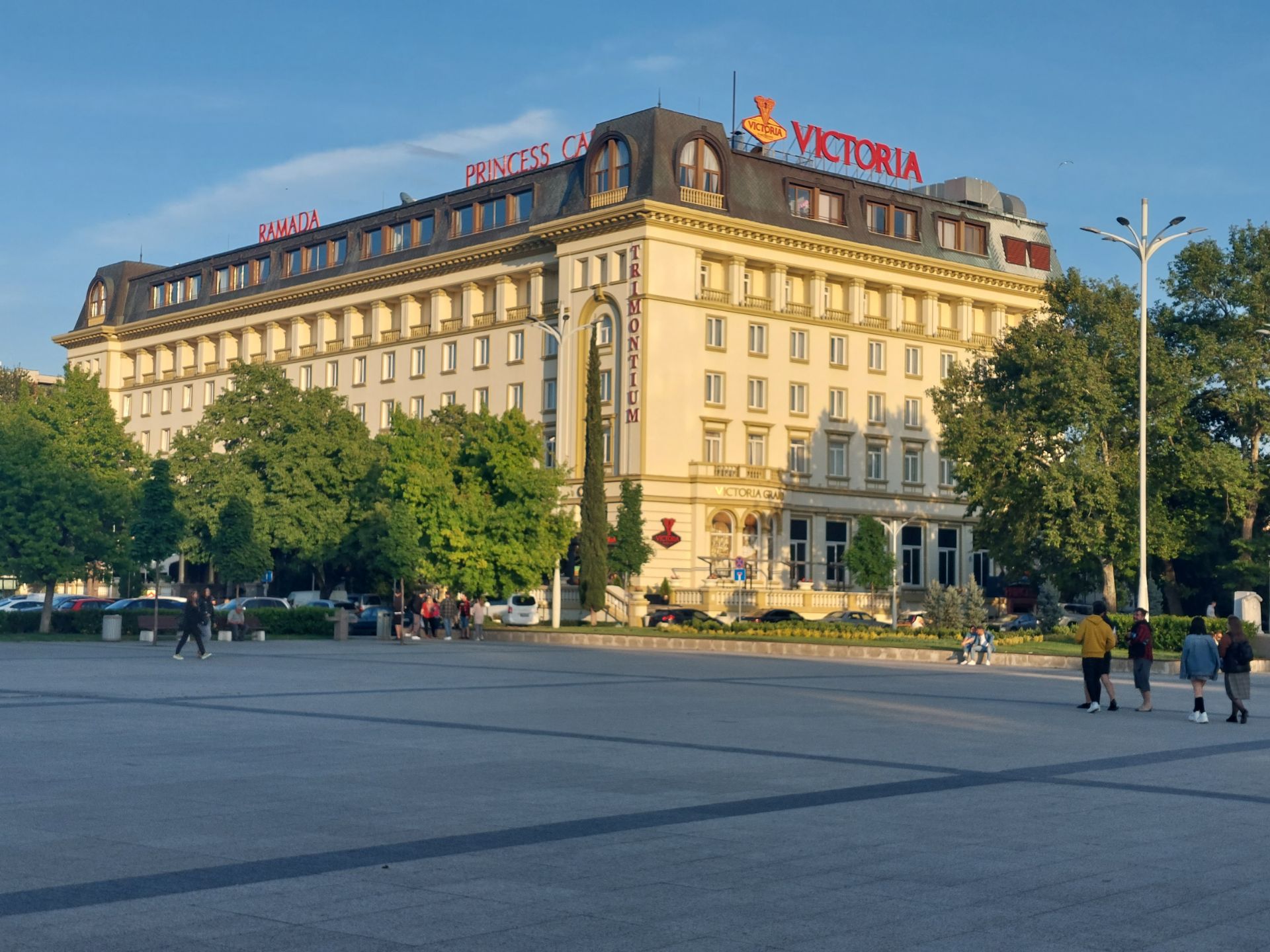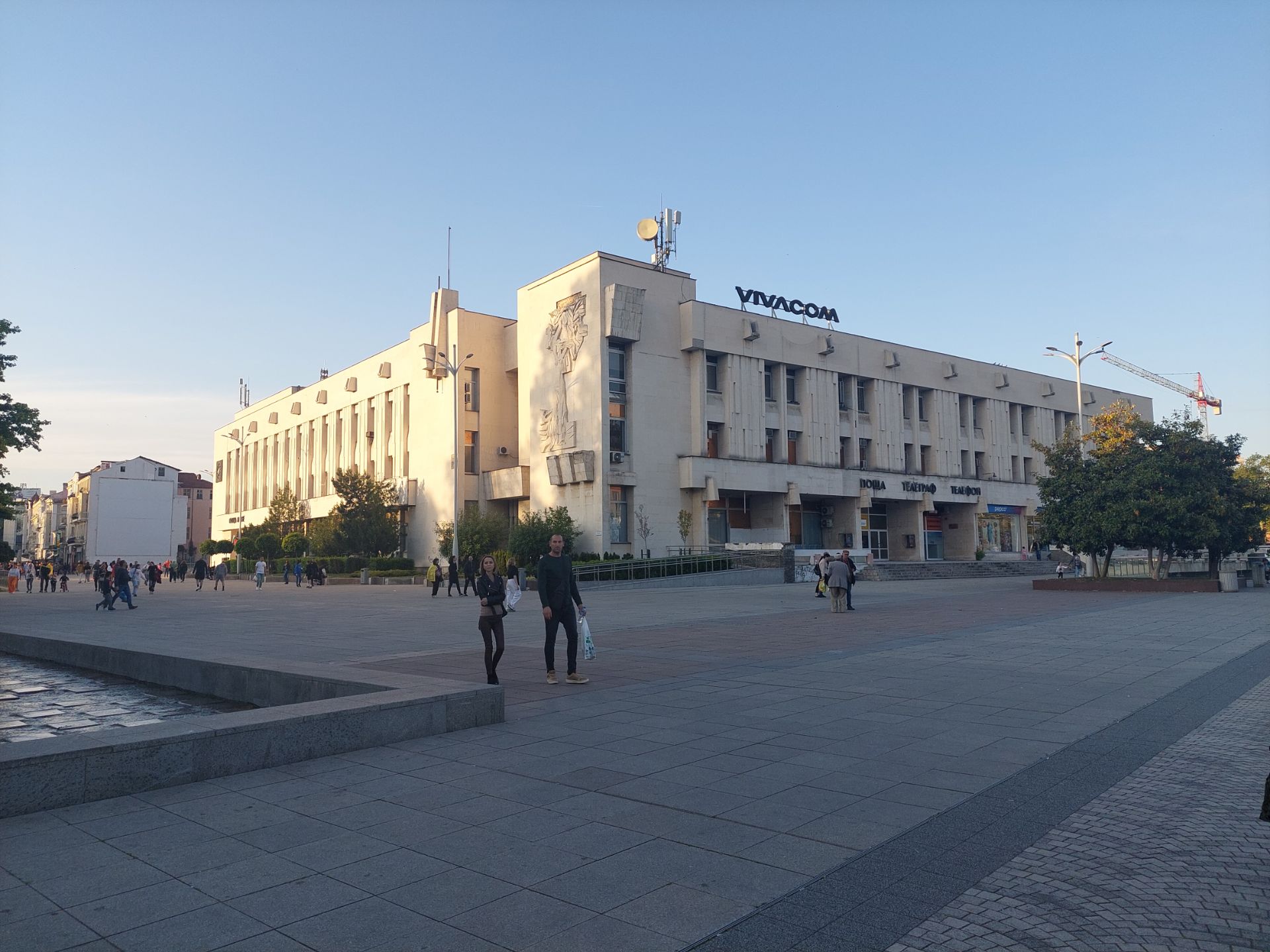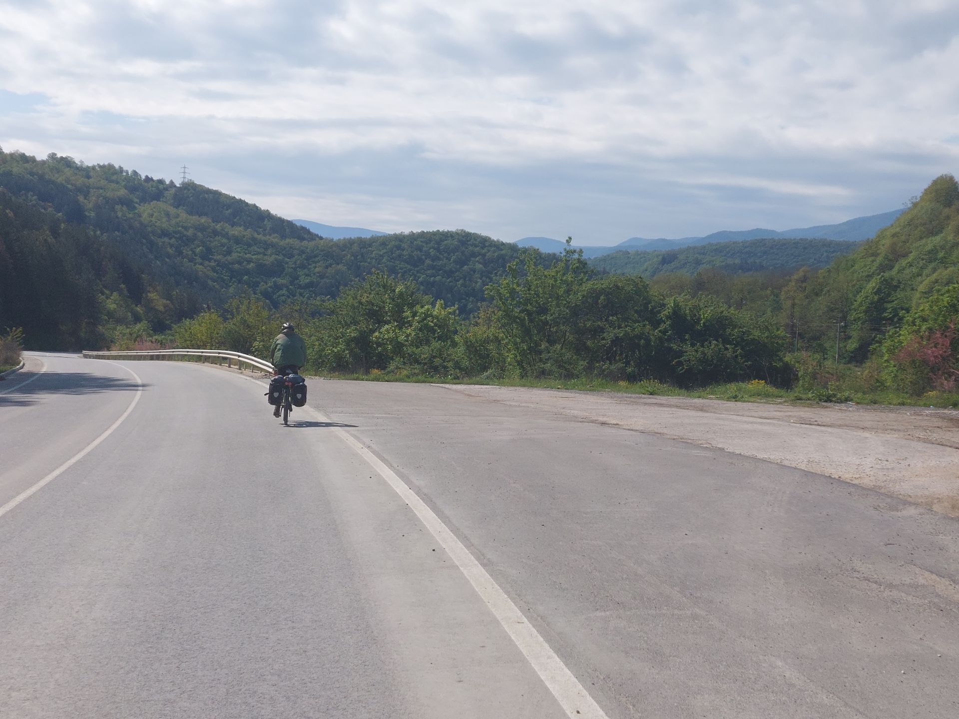 Nous avons attendu 8 heures ce matin pour déguster le petit-déjeuner complet de l’hôtel et plus précisément 8h20 puisque la réceptionniste m’avait dit qu’il y avait 20 minutes de préparation, 8h, nous étions, le café arriva rapidement, puis au bout de 10 minutes, un pain emballé dans du plastique, 3 morceaux de fromage, un carré de beurre, une barquette de confiture et œuf dur, si je n’ai pas compris la durée nécessaire, j’ai été bien rassasié. Départ tardif pour une longue étape sans difficulté, il fait 10°, vue sur la neige des sommets proches, puis après quelques kilomètres, le soleil se montre, il ne nous quittera plus de la journée. La route descend doucement dans une vallée, peu d’efforts pour avancer, vue sur la montagne rocheuse et boisée, quelques ruisseaux dévalent la pente, nous passons dans des espaces préservés, les rares villages prennent couleur sous la lumière, la nature dans toute sa splendeur comme je l’aime. Il y a peu de circulation, la vitesse est limitée à 50 kmh sur toute la longueur de la route et ça change tout vu du vélo cette différence, les véhicules ne déboulent pas avec grand bruit, nous ne sommes pas déportés pour la souffle et je me sens en sécurité, ce peut être une bonne idée pour faire cohabiter vélos et voitures sur les petites routes. Est-ce le retour de la chaleur ou de la forme, quand nous nous arrêtons, Pierre décide de changer la chaîne de son vélo dans le jardin public de la ville, une pure folie qu’il mène de main (sale) de maître, comme j’ai sous la main, il profesore di bicicletta, je me lance dans le changement des patins de frein, examen réussi. Nous sommes revenus dans la plaine, les petits magasins de plants, fleurs et décors de jardin se succèdent entre les serres et cultures, c’est samedi, les gens se pressent aux devantures, la circulation augmente. Nous passons ensuite par des sites industriels et dans une ville, nous découvrons un parc de plein air très récent équipé de jeux pour enfants et dans lequel beaucoup de gens pique-niquent, nous avons souvent rencontré dans les communes de Bulgarie des espaces verts équipés de jeux pour enfants, nous les avons appréciés lors de nos haltes, car il y a généralement des bancs, voire des tables. L’arrivée sir plovdiv est un peu dangereuse, piis carrément cahotique sur les pavés, je me demande toujours comment font les coureurs du Paris-Roubaix. Sortie dans la grande zone piétonne de la ville, vieux quartier, petites rues, nombreuses terrasses très fréquentée, c’est fleuri, flânerie avant le coucher du soleil, vestiges romain, stade, forum, odéon, une ancienne ville riche, active et cultivée, peu de bâtiments d’inspiration soviétique dans le centre, quelques immeubles néoclassiques et un vaste jardin public, constante, à l’instar des grandes places, des localités des Balkans. Une journée plaisante à tout point de vue.