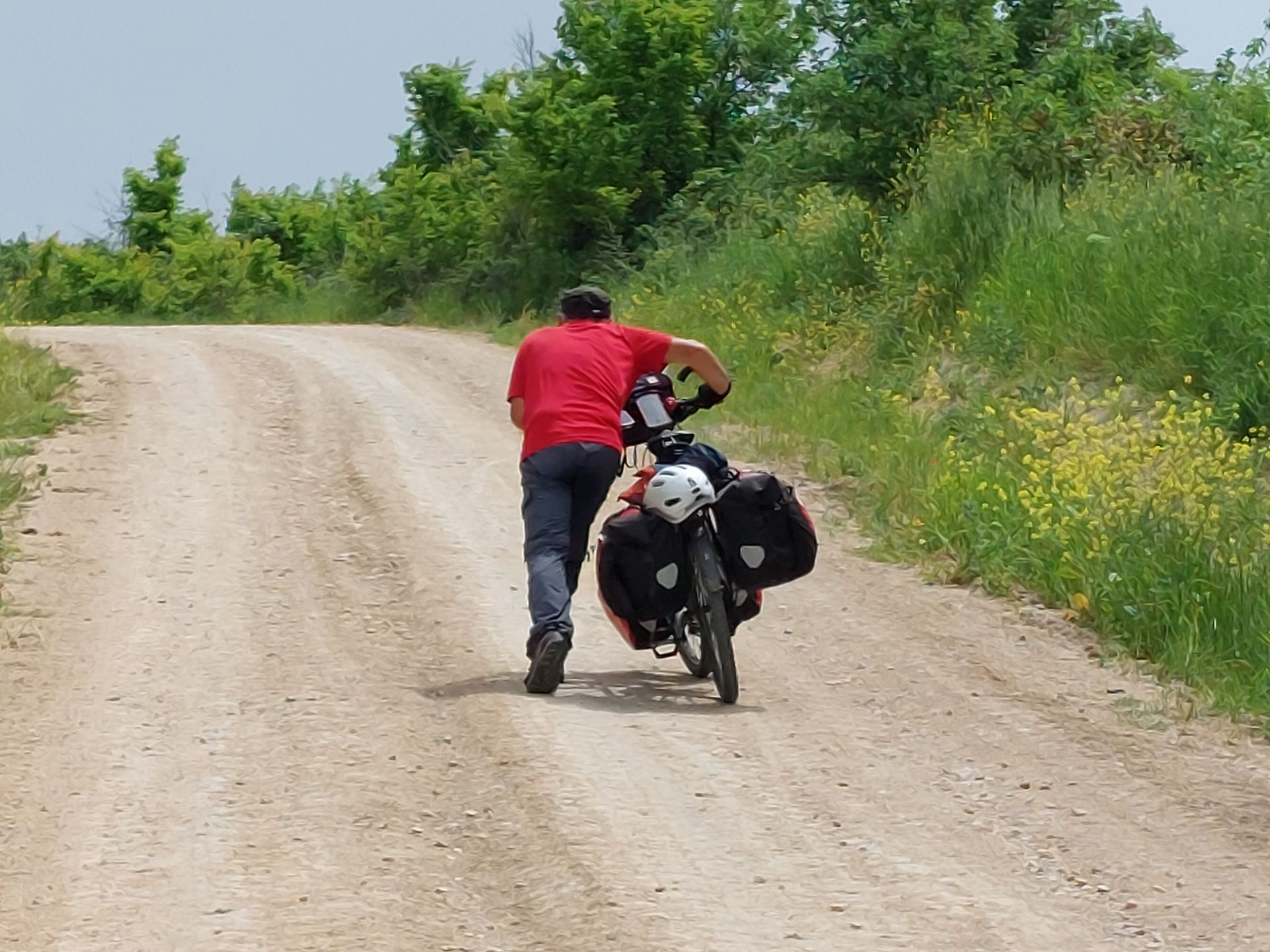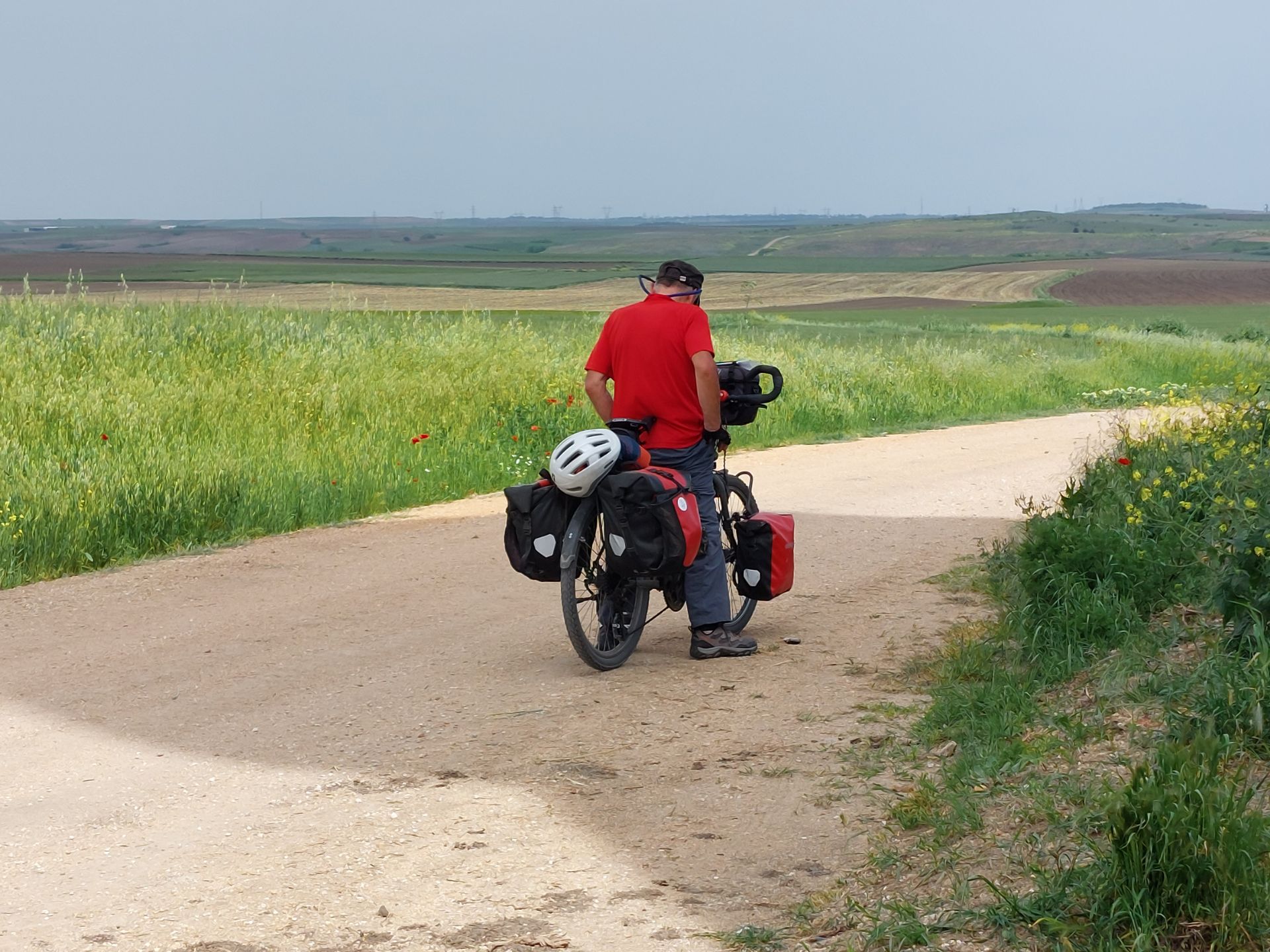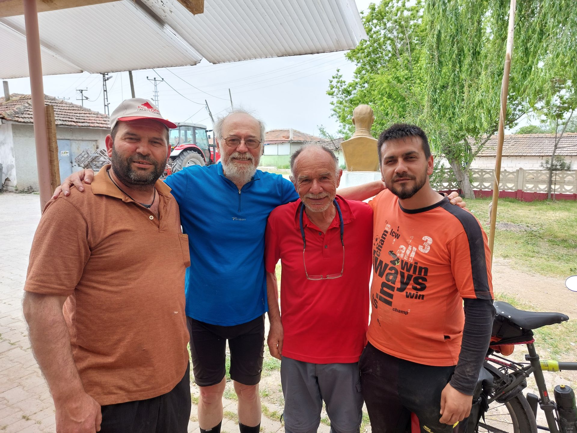 Ce matin l’appel du muezzin se répand et se répond en écho du haut des minarets, nombreux à Edirne, la mosquée Selimiye que nous avons aperçue en partant en compte quatre, c’est un monument remarquable inscrit au patrimoine mondial de l’unesco, nous n’avons pas pris le temps de la visiter, et les minarets jalonneront notre trajet du jour en nous annonçant les villages. L’entraîneur m’avait prévenu, aujourd’hui c’est du fractionné, confirmé quand j’ai vu le profil de l’étape en dents de scie et expérimenté avec les nombreuses côtes et descentes, généralement courtes et parfois bien raides. Une fois le chassé croisé matinal tari, nous roulons en sécurité sur la route, les automobilistes sont prudents, je peux regarder le paysage, c’est une mosaïque de champs en deux tons, marron quand la terre attend les semences, vert des céréales bien hautes déjà, c’est évidemment vallonné et la voie est rectiligne, nous voyons loin se succéder les doux plis du relief, seuls pointes de couleur, les coquelicots, bleuets, chardons, marguerites et autres fleurs décorant le large bas-côté. Quittant la grande route, c’est une campagne bien déserte que nous parcourons, seuls quelques villages égayent la monotonie des champs, la vie y coule tranquillement, nous croisons des troupeaux de vaches, moutons menés ou gardés par un berger, y a-t-il des communs pour le pâturage. Passant dans un village et saluant les hommes autour d’un bar, le patron nous interpelle et nous propose le thé, nous nous asseyons et dégustons la boisson chaude, pas habitué je trouve que c’est le moment de m’y mettre et ce sera un bon remontant pour la suite. Nos réserves alimentaires s’amenuisant, nous recherchons un restaurant, mais aucun endroit ne le propose, nous piochons dans nos sacoches et nous installons à la terrasse d’un estaminet (je ne sais pas comment se nomment ces débits de boisson en Turquie) dont le patron nous offre le thé, nous pose des questions sur nous, notre voyage et en informe les autres clients, nous comprenons que nous sommes un peu l’attraction du jour, une photo de groupe clôturera ce moment convivial. Les chemins gravillonnés, puis les pistes de terre remplacent la route, les rares véhicules déplacent des nuages de poussière, ça monte et ça descend toujours, je suis parfois obligé de mettre pied à terre, nous sommes réellement dans un désert malgré les cultures, les quelques personnes que nous croisons nous saluent généralement avec enthousiasme et un petit mot, ça fait plaisir.