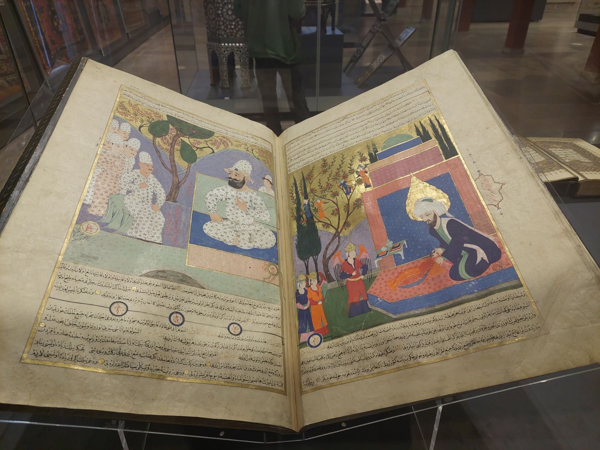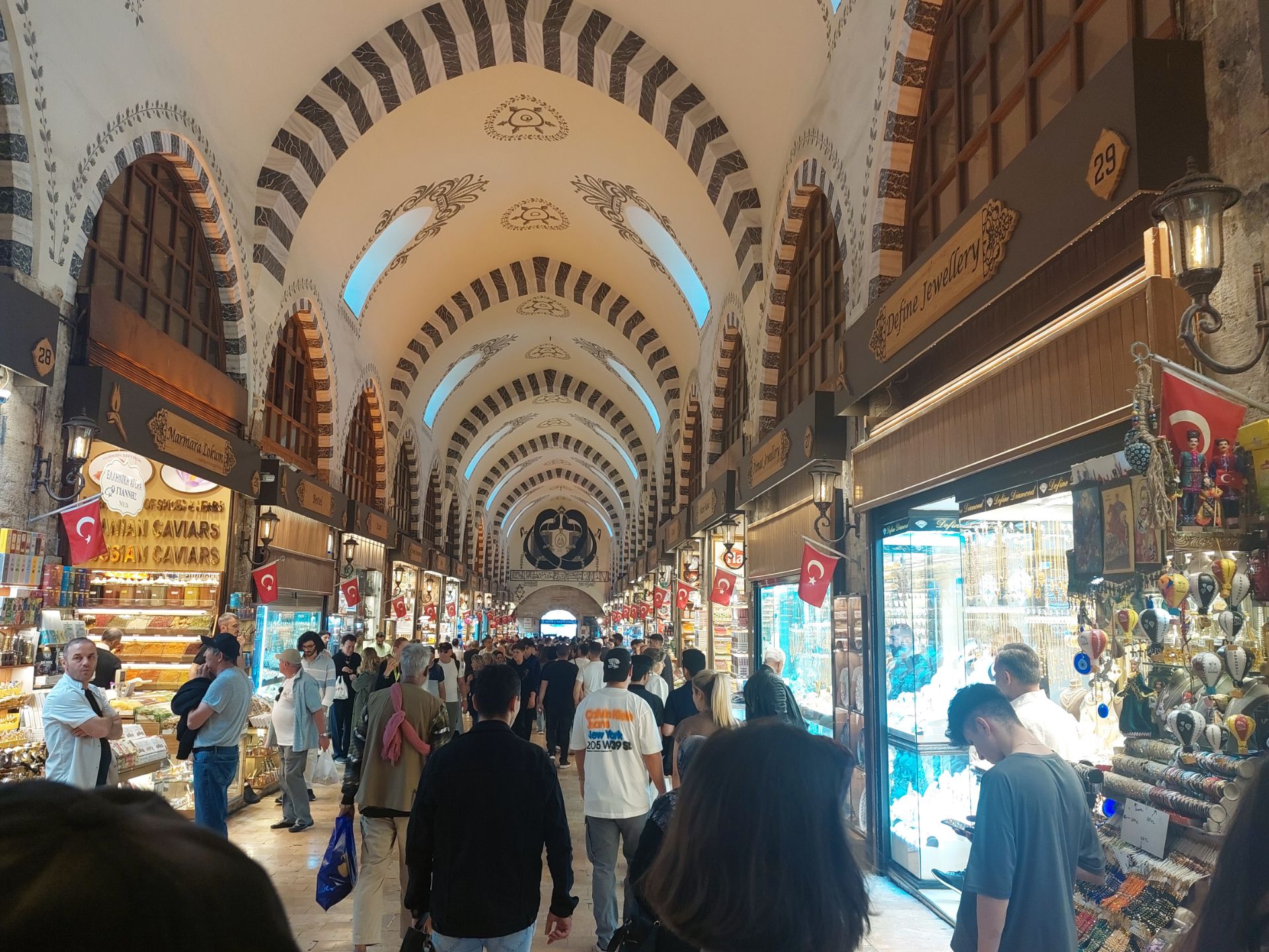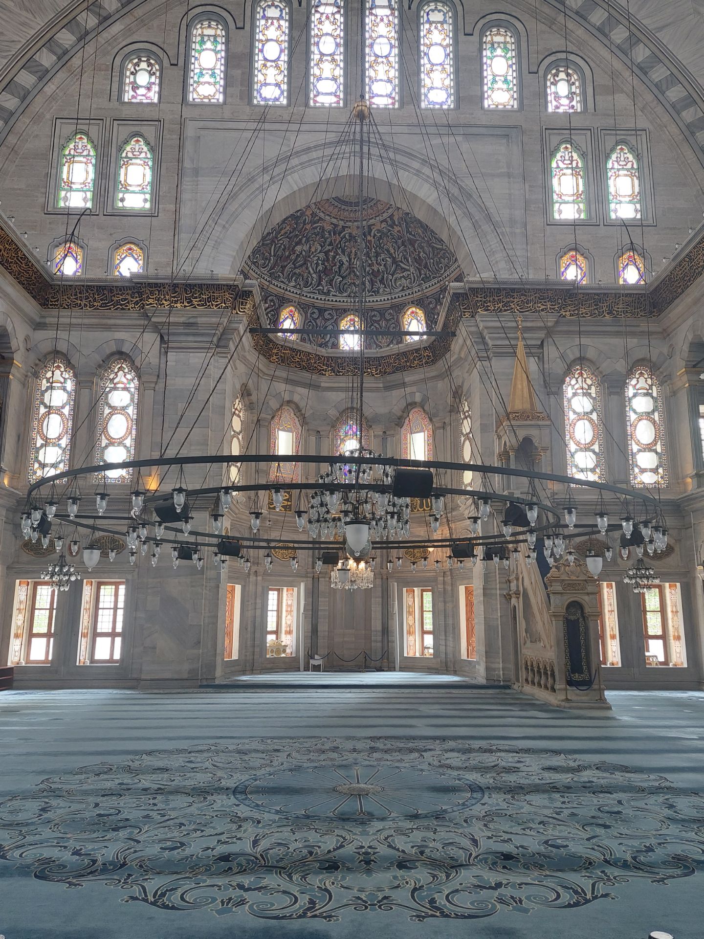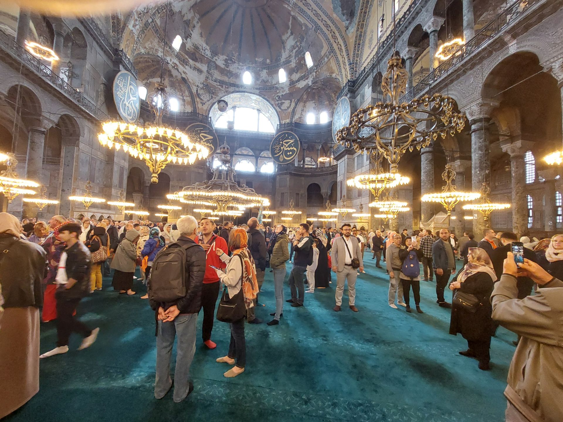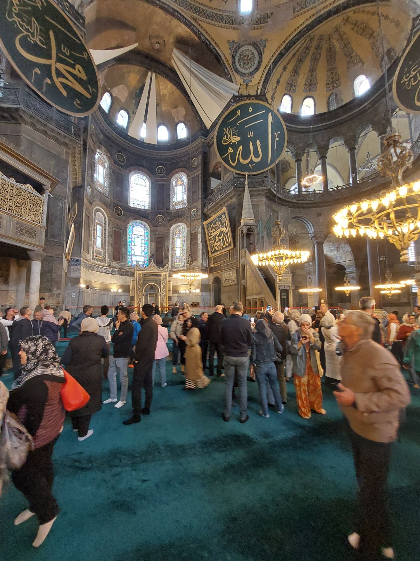 C’est évident, nous ne pouvions pas quitter Istanbul sans entrer dans l’ancienne basilique Sainte Sophie même si la file d’attente eest conséquente à notre arrivée. Construite au VIème siècle, devenue mosquée lors de la prise de Constantinople par l’empire Ottoman en 1453, musée en 1934, elle est redevenue mosquée en 2020. Sa forme à inspiré l’architecture des mosquée avec son volume intérieur immense, très aéré et éclairé grâce aux nombreuses fenêtres ouvertes dans les murs et coupoles, dont celle centrale surmontant l’ensemble, étayée par des colonnes monumentales. L’intérieur est dépouillé comme toutes les mosquées par absence d’iconographie, de mobilier religieux, j’ai juste vu une mosaïque de la vierge à l’enfant sur le tympan extérieur. Signe de l’ancienneté de l’édifice et de la fréquentation, les marches de marbre aux entrées sont usées et lissées par les pas des fidèles (on se déchausse après). Nous avons ensuite visité le musée des Arts turcs et islamiques, dont les collections couvrent un peu la période suivant celle du musée archéologique vu la veille, du 6ème (après Mahomet donc) au 20ème siècle, nous l’avons pris la visite à l’envers dans l’ordre chronologique inverse, mais ce n’était pas perturbant. On y trouve beaucoup de tapis de toutes les époques, certains de très grandes dimensions aux motifs géométriques, de nombreux manuscrits calligraphiés en langue arabe avec souvent des illustrations et enluminures. Quelques espaces avec du mobilier, des lampes, chandeliers, faïences, céramiques, bijoux. On y découvre au fil des siècles l’évolution des différents empires et la constitution des pays jusqu’à nos jours. Une partie est dédiée au prophète Mahomet avec des reliques dont ses poils de barbe et une empreinte de son pied. Original, un théâtre d’ombre turc qui met en scène deux marionnettes dont Karagöz, une sorte de Guignol, et un autre personnage, la rencontre est source de dialogue, d’incompréhension et dispute si j’ai bien compris le court extrait, ce type de spectacle a été créé dès le 16ème siècle. Nous avions prévu de rentrer dans le grand bazard couvert, mais c’est dimanche jour de fermeture, nous avons poussé un peu plus loin vers le marché égyptien où marché aux épices, vaste étendue couverte dédiée aux épices, fruits secs et à tout ce qui se vend ici et ailleurs. Retour par le pont qui enjambe l’embouchure de la Corne d’or, nombreux bateaux de croisière conduisant jusqu’au Bosphore, pendant que les pêcheurs s’alignent le long de la balustrade.