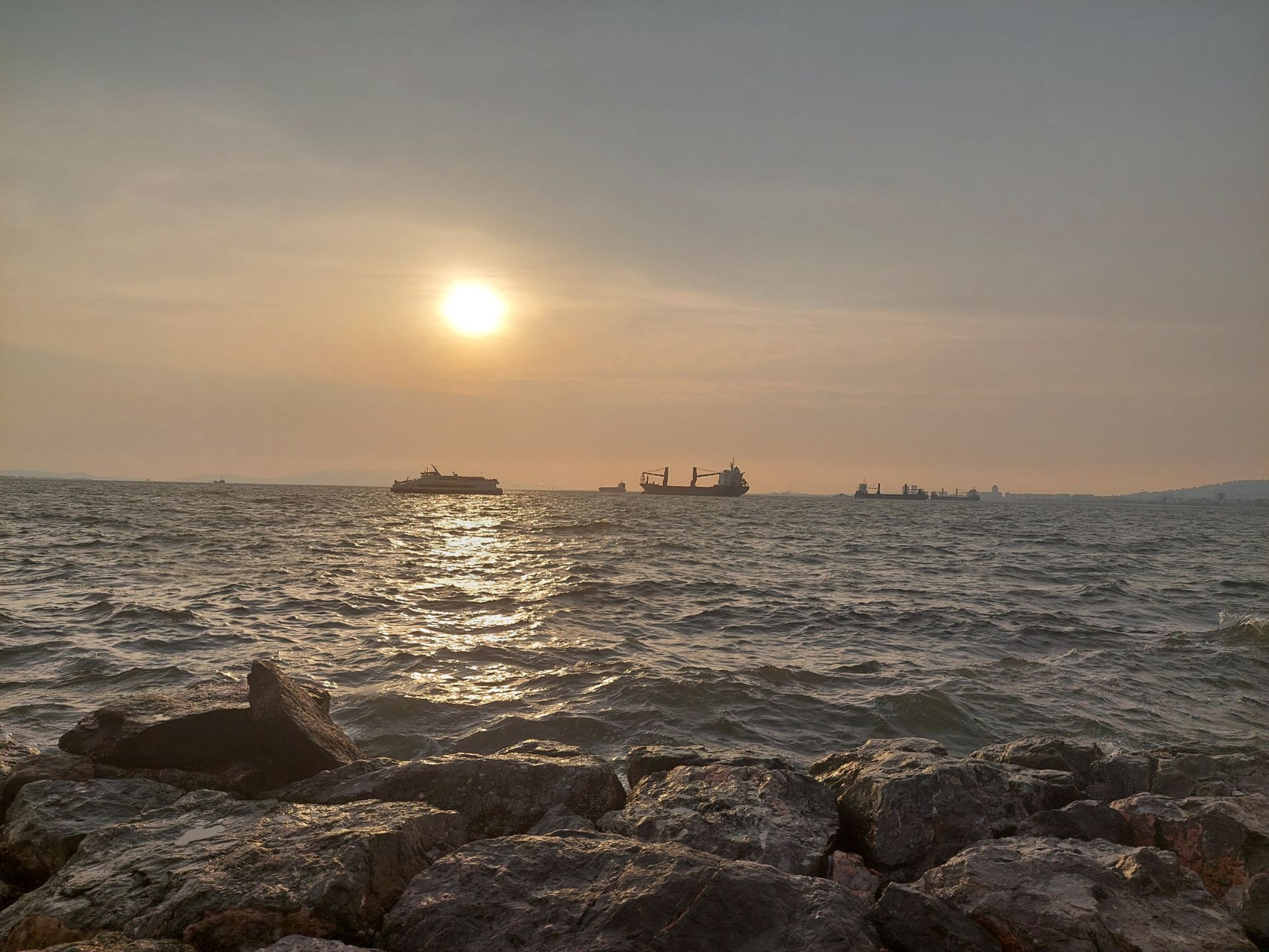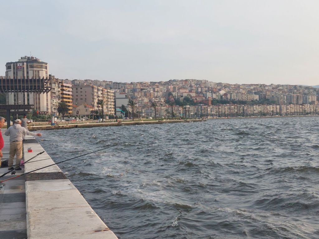 Balade de santé prévue pour le parcours vers Izmir, pas trop long, sans dénivelé, juste une petite inquiétude pour entrer dans la troisième ville de Turquie, le traumatisme d’Istanbul n’est pas loin, même si le soleil est maintenant bien ancré dans le ciel. Petit déjeuner turc à l’hôtel, le buffet est bien garni, j’apprécie et me régale de la diversité, tomates, concombre, poivrons, olives, fromages, œufs, burek, petits pains garnis fromage ou olive, persil, pousses de fenouil, piments, fruits, miel, confitures, une sorte de ratatouille dans laquelle on trempé son pain, du thé bien sûr, café, beurre etc. Nous retrouvons le couple de cyclistes hollandais dont j’avais repéré les vélos hier soir près des nôtres, attablés à la première heure comme nous, c’est à la fraîche qu’on pédale le mieux. Nous empruntons d’abord la même route qu’hier, jusqu’à la sortie de la ville, puis rapidement après l’université, c’est une piste légèrement humidifiée, ce qui épargne la poussière, pas les cahots par contre, c’est le début, je suis indulgent. Les petites parcelles cultivées défilent, beaucoup d’oliviers, des arbres fruitiers, quelques légumes, des figuiers en bordure déjà bien fournis en fruits verts, nous passons un peu tôt pour se servir. La rivière est en léger contrebas, bientôt nous longerons un long canal d’irrigation, les champs sont plus vastes, traversons une première ville sans trop de difficultés, puis Izmir se rapproche, premier échangeur, la nouvelle piste cyclable n’est pas encore en service, on s’en passe. A l’approche, circulation, carrefours, feux, arrêt, redémarrage louvouyant, pas simple de mettre en mouvement en ligne les quelques 100 kg de l’équipage, surtout si j’oublie de passer la bonne vitesse avant, la largeur gène, les voitures ralentissent et me ménagent généralement, je ne suis pas très à l’aise chargé ainsi, une piste cyclable bienvenue facilite la progression. L’arrivée à l’hébergement est un peu compliquée, je ne comprends pas les explications, la ville est un labyrinthe encombré, Pierre s’en sort avec les honneurs. Petit tour dans la ville vers la tour de l’horloge, j’ai plaisir à humer l’air de la mer le long de la promenade bordant le rivage, nous grimpons dans les hauteurs par des escaliers bien raides et redescendons par l’Asansör, double ascenseur qui offre une belle vue sur la baie. Le temps est clair, nous regardons le soleil se coucher, puis disparaître.