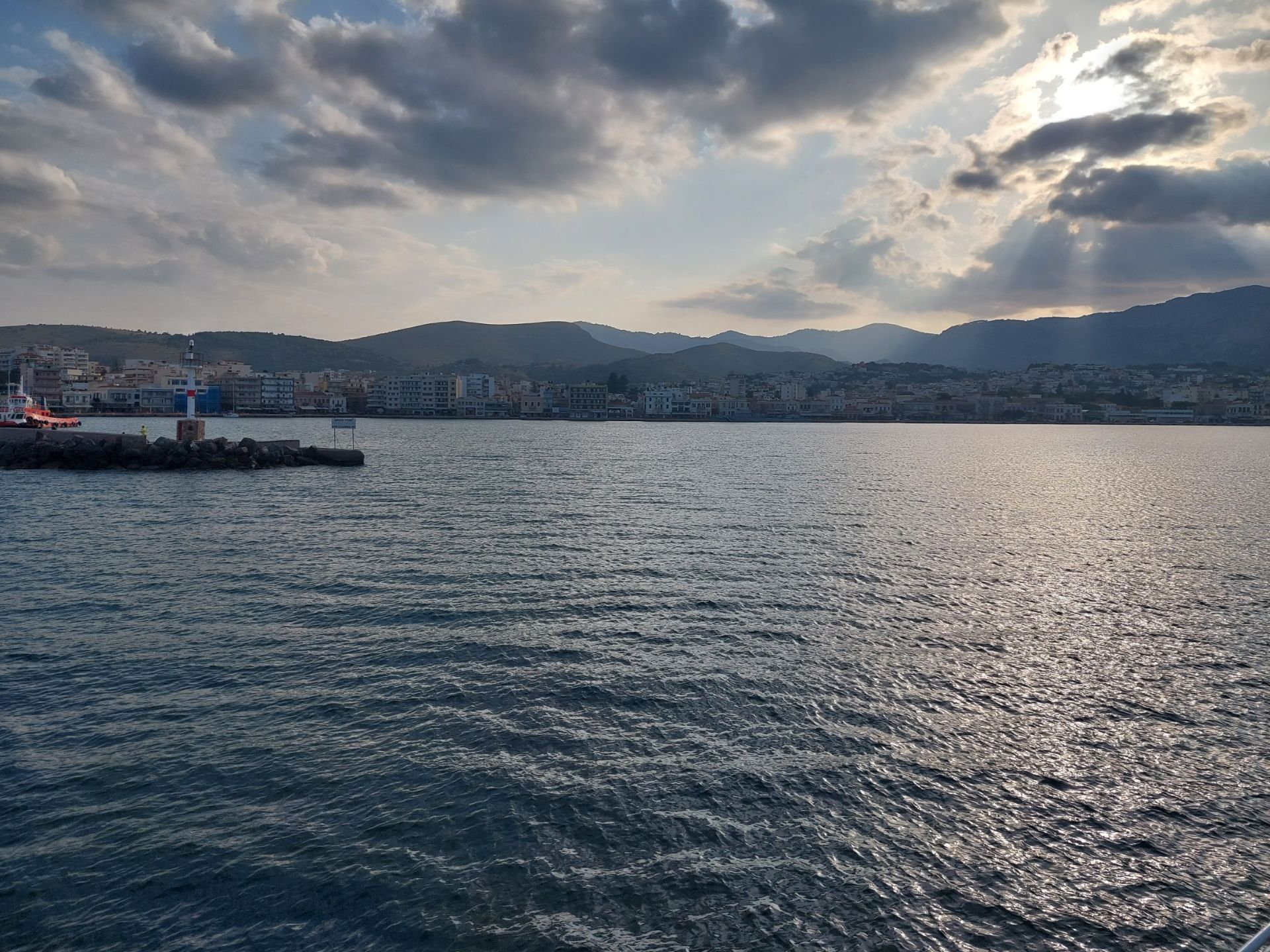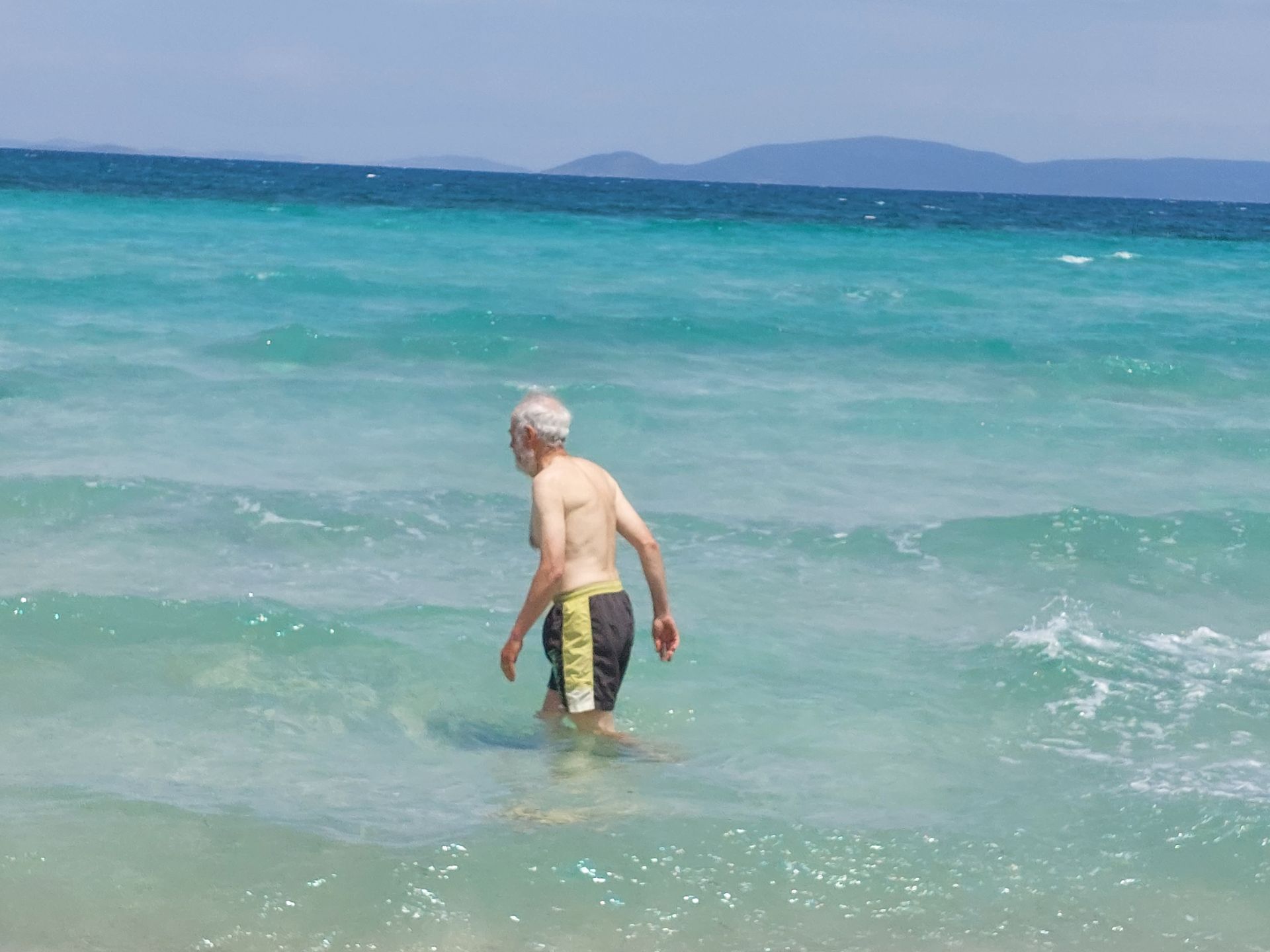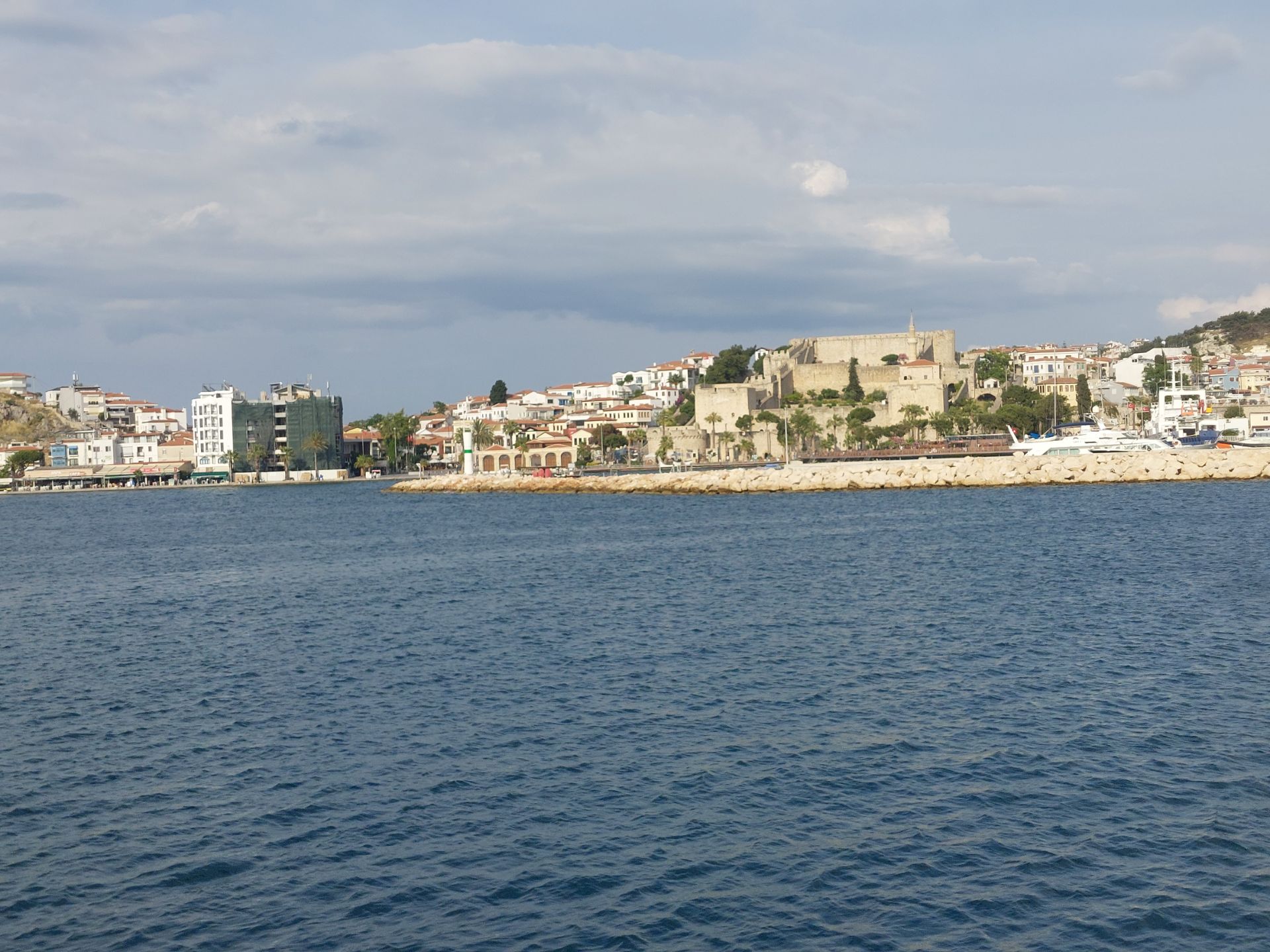 Aujourd’hui nous devons prendre le bateau pour l’île grecque se Chios après notre étape du jour, aissi pour parer à toute éventualité, nous décidons de partir tôt, le muezzin certainement au courant me hurle dans les oreilles avant 5 heures, c’est parti, deux doses de café, petit déjeuner, bagages, Pierre descend les vélos par l’escalier, 6h15 nous rejoignons les quais d’Izmir. Un rayon du soleil levant rallume les bateaux amarrés et se reflète dans les fenêtres des immeubles, la piste cyclable qui longe la mer est agréable, les pêcheurs à la ligne guettent l’appel du large, la température est douce, nous avançons sans effort, c’est bon. Tout ayant une fin, la route nous rattrape par la bretelle, nous côtoyons les voitures, c’est encore plat, la mer se cache un peu, quand nous la retrouvons, nous nous délestons de notre monnaie turque dans une petite boulangerie et lestons nos estomacs en prévision des montées à venir, qui ne tardent pas à se présenter. Nous sommes dans un paysage de garrigue, pierres, arbres bas, buissons, peu de fleurs, les jambes invitent la tête à demander un changement de braquet, même si le panorama ne defile pas très vite. Quand nous quittons la grand route, autour d’une rase végétation, ne poussent qu’éoliennes et pylônes électriques, ensuite la mer se montre à nouveau d’un bleu éclatant, avec l’aide de la carte, nous essayons de situer îles et côtes, peine perdue, tout est emmêlé, bravo les géographes. Nous n’avons plus que quelques kilomètres à parcourir, une belle plage de sable au détour de la route, Pierre se jette à l’eau. La fin se fait au milieu des travaux routiers, le bord de mer se prépare à accueillir les estivants, nous n’aurons que la poussière, les cailloux et les ornières pour atteindre Cesme, dernière ville de notre séjour en Turquie. Retirant les billets pour le ferry, nous apprenons que le bureau d’enregistrement ouvre à 17 heures, nous retournons vers un coin plus agréable de Cesme, sirotons une bière en terrasse, car à Cesme comme à Izmir, la bière ne se cache pas, c’est certainement pour ça qu’il y a plus de cyclistes. A la banque, nous laissons une liasse de billets en livres turques pour récolter une vingtaine d’euros. Avant l’embarquement, passage sourcilleux à la douane turque, puis traversée obligatoire dans le duty free, le ferry est petit, seules 2 voitures entrent, 5 motos et nos deux vélos, ouf. Courte traversée, passage de la douane grecque qui cherche si nous transportons des cigarettes, fouilles d’une sacoche, l’hébergement est tout près du port de Chios.