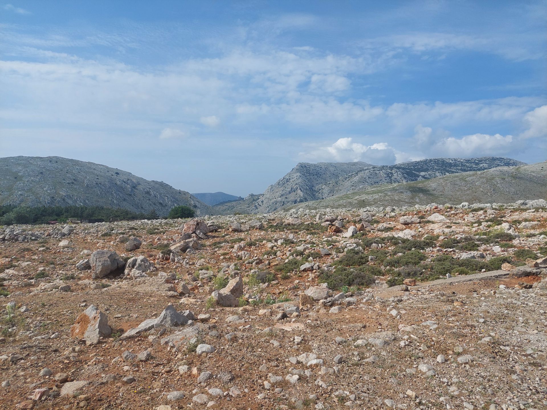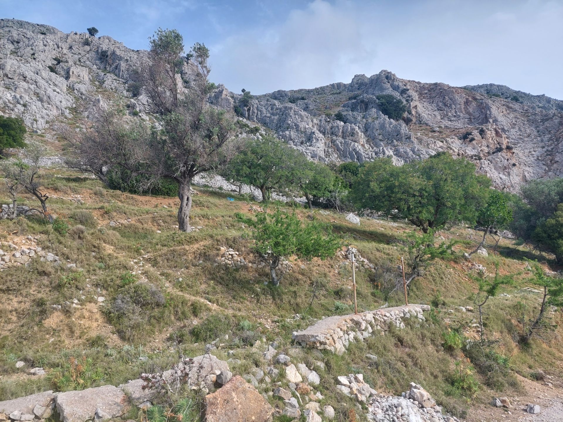Journée à Chios, Pierre a concocté un circuit dans l’île, nos vélos nous permettent d’aller au delà de la ville dans les hauteurs que j’ai aperçues hier depuis le ferry, longueur et dénivelé prévus sont raisonnables pour moi après la nuit de repos, ça doit monter principalement dans la première partie, celle où je suis le plus frais. Départ tranquille, ça monte doucement, les bagages en moins font une grande différence, je n’ai pas la sensation d’être retenu par l’arrière, la route après avoir quitté la ville est large, en très bon état, nous sommes seuls ou presque, le vent légèrement frais nous pousse ou pas, il est bienvenu. Au dessus de nous la falaise, mur de roches, autour de nous paysage minéral plus adouci dans sa forme, un peu de vert témoigne d’une végétation rase, un peu plus loin, ce sont des arbres, résineux objet de soins semble-t-il, parfois entourés de clôtures probablement pour les protéger des chèvres en liberté, ce pourrait s’agir de l’arbre au mastic, ou Pistachier lentisque (merci Wikipedia), dont la production à Chios est très réputée, énigme non résolue. J’avance bien (je m’autocongratule), nous avons parcouru la presque totalité de la première et plus longue montée quand la route s’arrête brusquement, je fais quelques mètres sur les cailloux et mets rapidement pied à terre, impossible de continuer avec nos vélos. Rapide tour d’horizon sur la carte, Pierre trouve une alternative qui rallonge de circuit de 40 km, j’hésite longuement et finalement ne tente pas l’aventure, je fais demi-tour laissant Pierre seul dans ce désert. Retour en prenant le temps de regarder l’autre point de vue de cette montagne ayant les pieds dans l’eau.