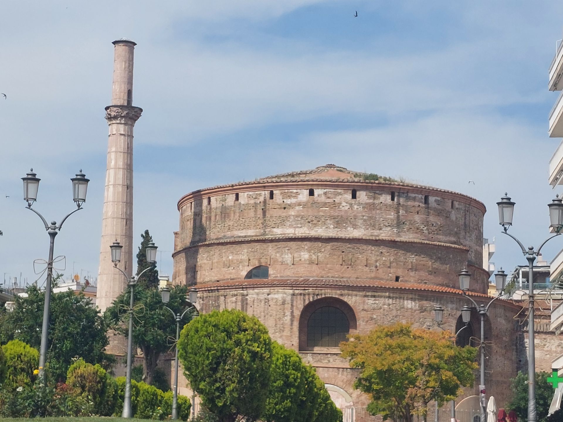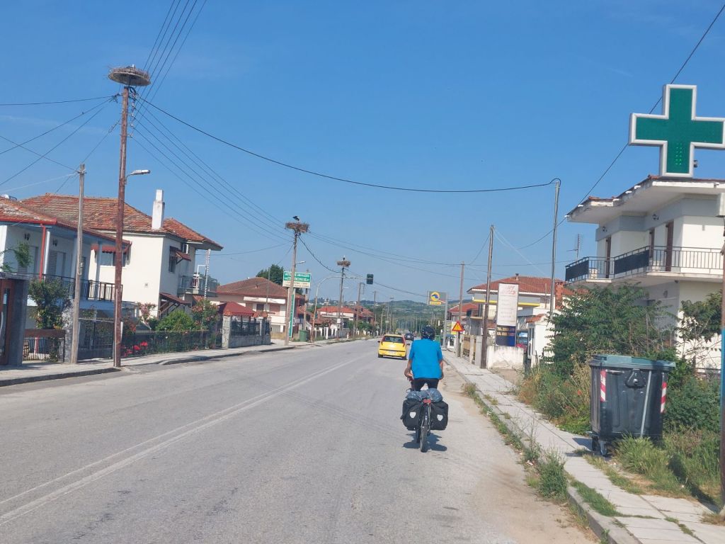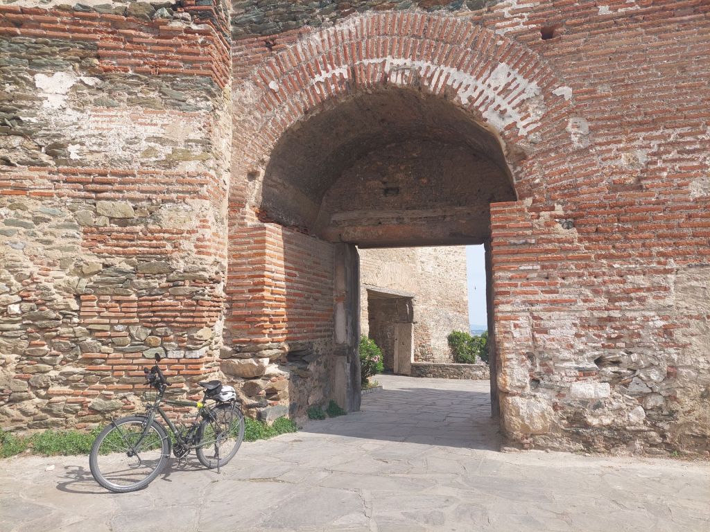 Le soleil brille sur la mer en Grèce, on y reste, direction Thessalonique notre étape de ce soir, nous traversons la rue principale de la petite ville d’Asprovalta, encore bien endormie, pour ensuite prendre une plus grande route, les montagnes couvertes de feuillus se rapprochent de chaque côté, la vallée se resserre, nous sommes sous un frais couvert végétal qui en vient à manger le bas-côté, ici fauchage et débroussaillage très tardif. Bifurquation sur une voie secondaire, la perspective s’élargit sur les cultures, oliviers, vignes, tomates, arrosage et irrigation, cailloux, sable, plantes dans les lits de rivières plus d’eau. Ensuite, les plantations disparaissent, place à la diversité des plantes autour de la route, le circulation repousse à peine cette luxuriance qui ne demande qu’à s’étendre. Nous longeons pendant une vingtaine de kilomètres le lac Volvi, aussi vaste qu’une mer intérieure il occupe une bonne partie de la vallée élargie. En passant dans le village de Nimphopetra, c’est un alignement de nids de cigognes, perchés sur les plates-formes disposées sur les poteaux électriques, les cigogneaux ont éclos, je vois leur cou dépasser, les parents les nourrissent ou planent à la recherche de nourriture, ce voyage m’aura permis de voir de près cet oiseau mythique qui a failli disparaître, merci à tous ceux qui ont permis sa sauvegarde. A la sortie du village, nous nous arrêtons dans un étonnant lieu, planté de pierres calcaires difformes, après les nombreuses explications mythologiques, ce serait en réalité, des geysers chargés en concentration de roches dissoutes qui auraient édifié ces monuments étranges. Après 70 km de route à peu près plane, j’avais bien en tête la montée avant Thessalonique, qui présente en apparence peu de difficulté, sauf le début qui me fait rapidement poser le pied à terre, la suite sera sans souci, nous arrivons assez tôt à la fin du parcours pour visiter la ville, direction place Aristote, ouverte sur la mer, c’est une esplanade en plusieurs parties entrecoupée de rues, l’homme a sa statue de bronze et également une université à son nom. Nous longeons le front de mer jusqu’à la tour blanche, fortification symbole de la ville aujourd’hui après sa rénovation, elle n’a pas connu que des moments heureux, des répliques de bateaux anciens, trirèmes ou pirates parcourent le front de mer pour les touristes. Ayant encore un peu d’énergie, nous allons dans la vieille ville, l’arc de galère, la rotonde puis grimpons vers l’Heptapyrgion ancienne forteresse byzantine dont les épais murs d’enceinte dominent la ville.