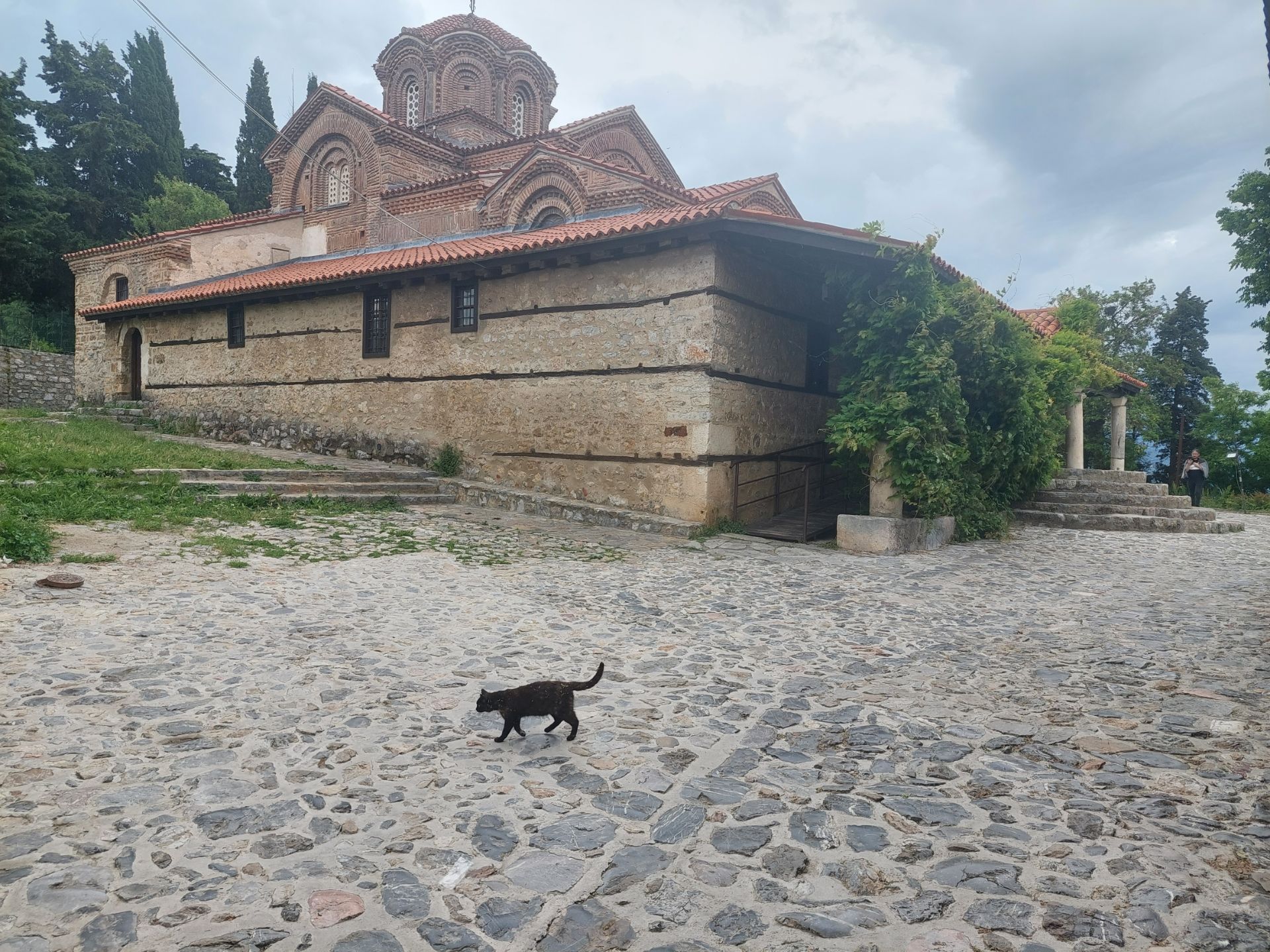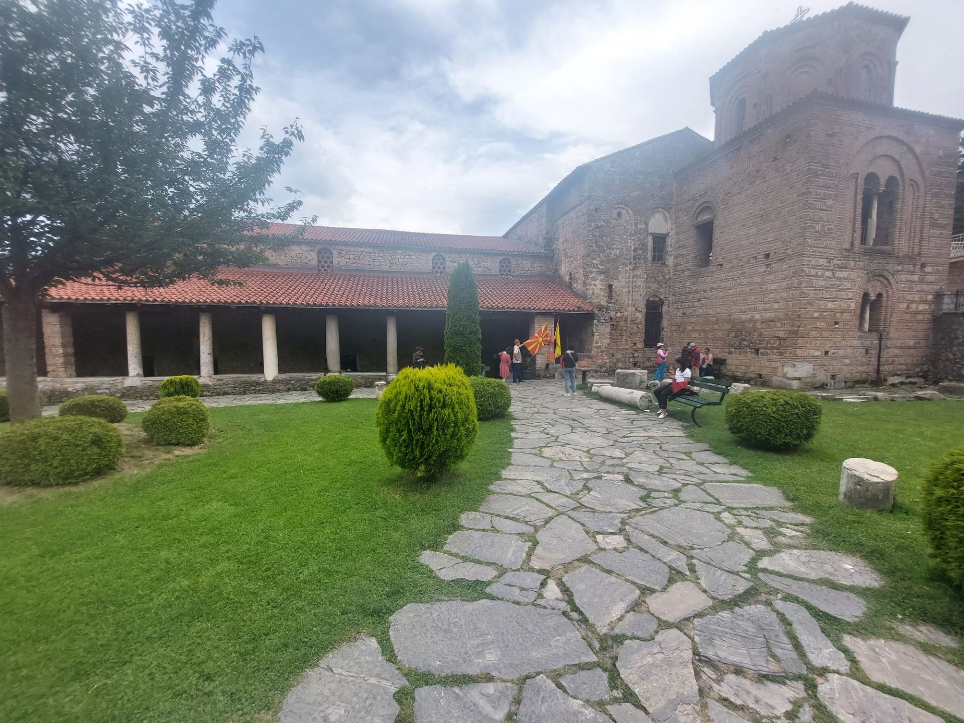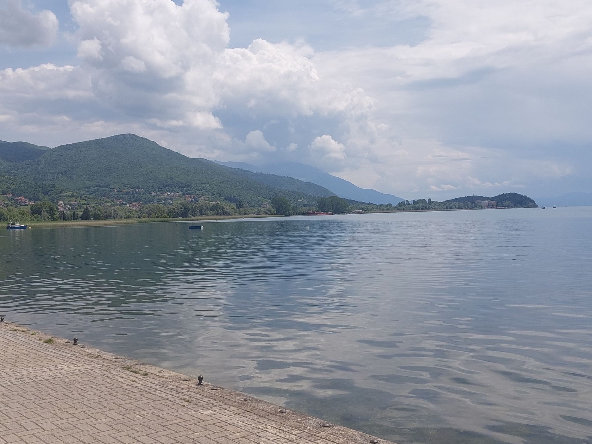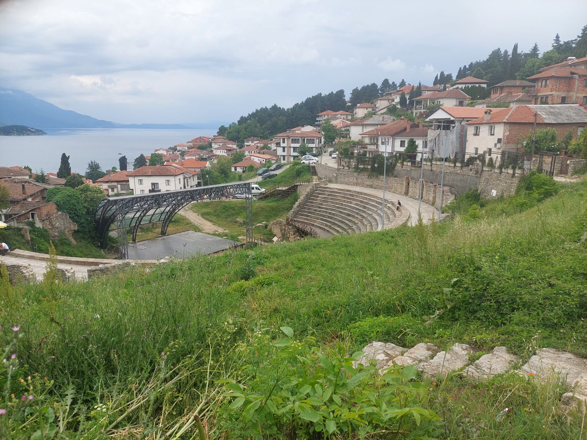 Après avoir quitté Turquie et Grèce, retour dans l’heure d’été « française », le jour se lève tôt, nous aussi pour ce dernier jour en Macédoine du Nord, l’étape n’est pas très longue, dès le début nous nous dirigeons vers la montagne qui nous accompagnera aujourd’hui, nous apercevons quelques traces de neige sur les sommets bien verts maintenant et montons doucement sur une route tranquille bien agréable. La deuxième pente s’annonce un peu ardue, c’est la montée de la tour Eiffel sans les antennes et nous arrivons à l’altitude 1164 mètres, bifurquation sur une petite route qui est l’ancienne voie délaissée et déserte, ma seule crainte dans ce cas est que ça se termine par une barrière, un merlon, mais non ce seront juste des pavés sur quelques kilomètres, c’est assez désagréable pour les hommes et les machines. Nous faisons quelques courses à Resen et mangeons dans le grand parc contigu bien pourvu en bancs que la population locale occupe en discutant, nous avons souvent vu dans les Balkans ces grandes places qui rassemblent les gens, un peu comme dans Pagnol y compris les terrasses bien fréquentées, par contre pas de boules, juste quelques jeux de cartes ou échecs. Nouvelle ascension, nous nous engageons dans une vallée étroite qui s’élargit par la suite, la montagne est verte de sa forêt, 1170 mètres puis descente continue sur Ohrid pendant 20 kilomètres, l’entrée de la ville n’est pas extraordinaire, car ce qu’il faut voir se trouve sur les rives du lac nous dira Nicoletta, la gérante de l’auberge de jeunesse. Le lac est le plus grand du pays (358 km²), le plus profond des Balkans, un des plus vieux du monde dit Wikipedia, une partie est en Albanie. Près de la rive, au bout de la promenade très cité balnéaire, nous visitons la vieille ville, petites ruelles, escaliers, vieilles maisons, églises dont une Sainte Sophie très populaire dans les Balkans, un théâtre antique et une imposante forteresse remaniée au cours des siècles, nous écourtons la visite quand l’orage menace, mais il ne s’est encore pas déclaré.