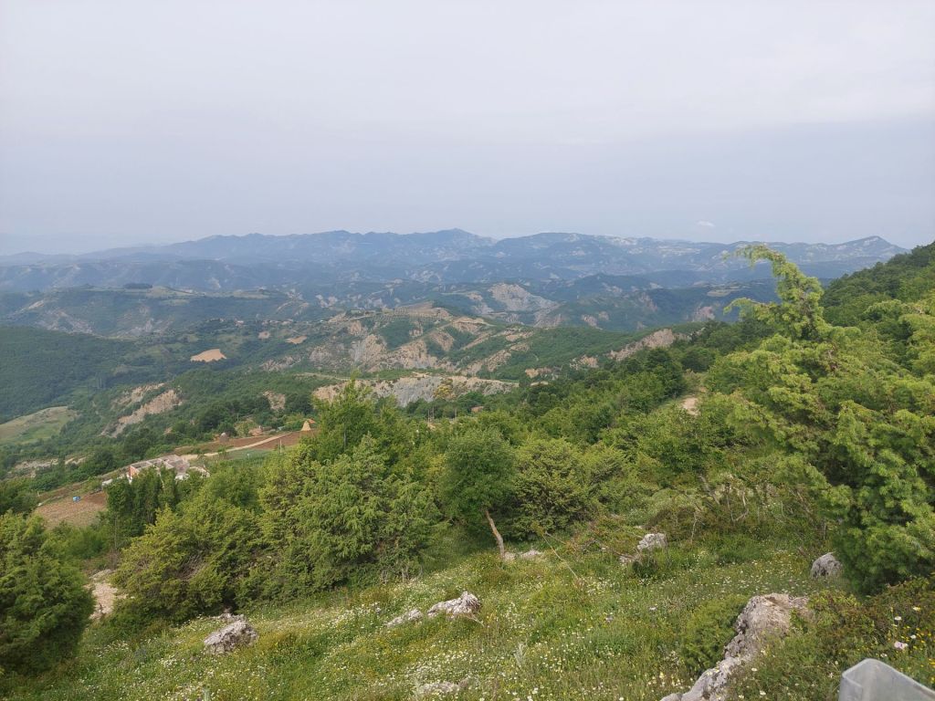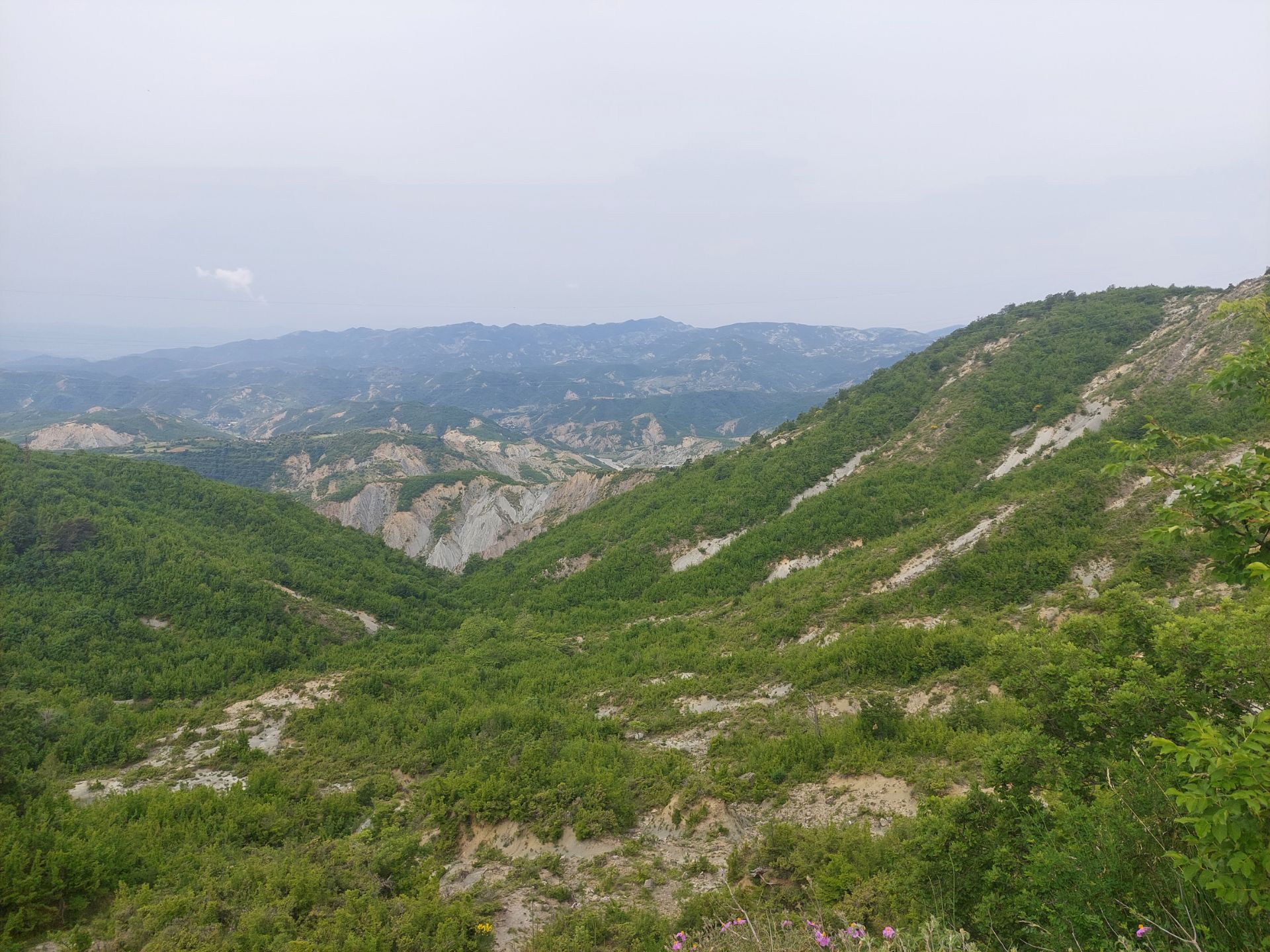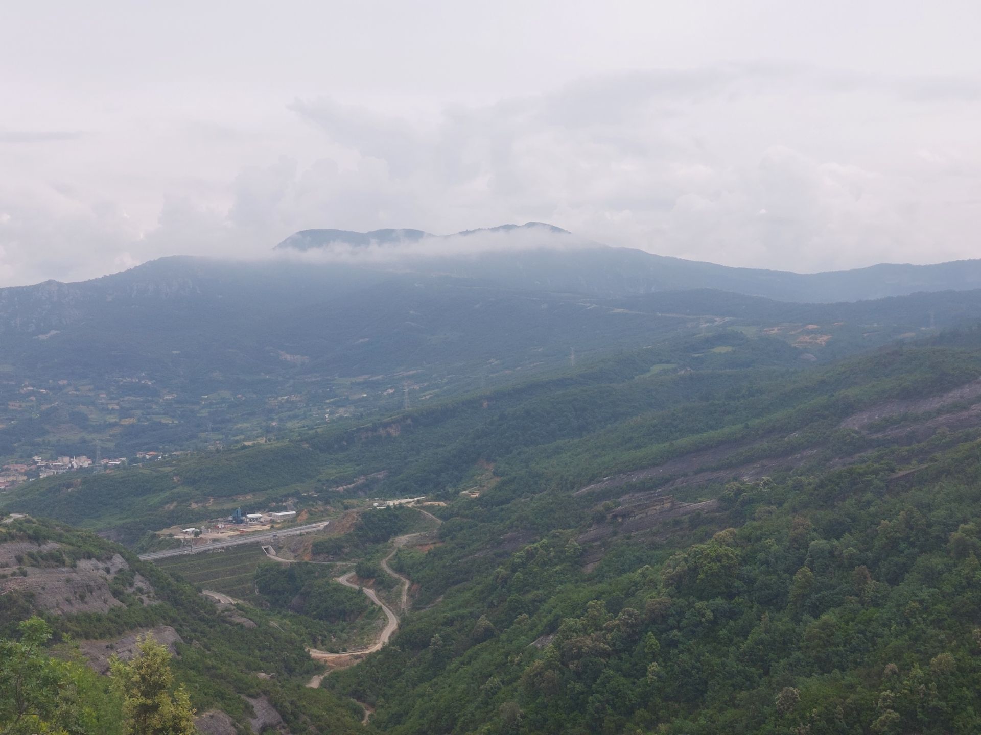 Les poules de notre adorable logeuse ont fourni les œufs du petit déjeuner servi tôt ce matin dans le jardin pour nous permettre d’atteindre Tirana, courte étape qui passe par la montagne. Sortis d’Elbasan dans une légère brume, nous croisons les producteurs jardiniers ou fermiers qui tractent leur chargement sur des carrioles motorisées avant de s’installer en bord de rue, nous laissons leur commerce pour suivre une petite route qui monte assez rapidement, nous faisant découvrir les fumées de la zone industrielle de la ville. Ce qui est gratifiant quand je commence à prendre de la hauteur, c’est le panorama qui s’affiche rapidement en dessous. La montée n’est pas trop sévère, juste longue, nous profitons des paysages en étant quasiment seuls, pas de bruit de circulation, plus de bruit sur le vélo qui monte en silence, de loin en loin quelques bergers surveillent de maigres troupeaux de chèvres ou de vaches qui broutent la végétation du bas côté, le lait produit, transporté dans les bouteilles dépareillées, alimentera demain Elbasan. Plus on s’élève, plus le paysage devient impressionnant, nous ne montons qu’à l’altitude 800 mètres, pourtant j’ai l’impression d’être sur le toit du monde, survolant les sommets et vallées que je découvre en dessous, comme la pente s’est atténuée, je profite plus longtemps de la vue. Au sommet, nous n’avons pas assez d’argent local pour nous offrir à manger, nous nous contentons de deux bières. Nous engageons la conversation avec deux jeunes cyclistes suisses qui vont également à Tirana et envisagent de rester un peu en Albanie avant de remonter dans leur pays. La descente est assez raide, je traîne un peu les yeux sur les paysages très rocheux du versant Est, puis nous rejoignons la circulation avant l’arrivée sur Tirana, bien se méfier des priorités qui ne sont pas garanties pour les vélos, des portières qui s’ouvrent inopinément, des véhicules garés en double file, rien que du très habituel. Dans la ville, les pistes cyclables nous éloignent du flot urbain des grandes artères encombrées, nous arrivons tôt pour prendre possession de l’appartement pour deux jours dans la capitale.