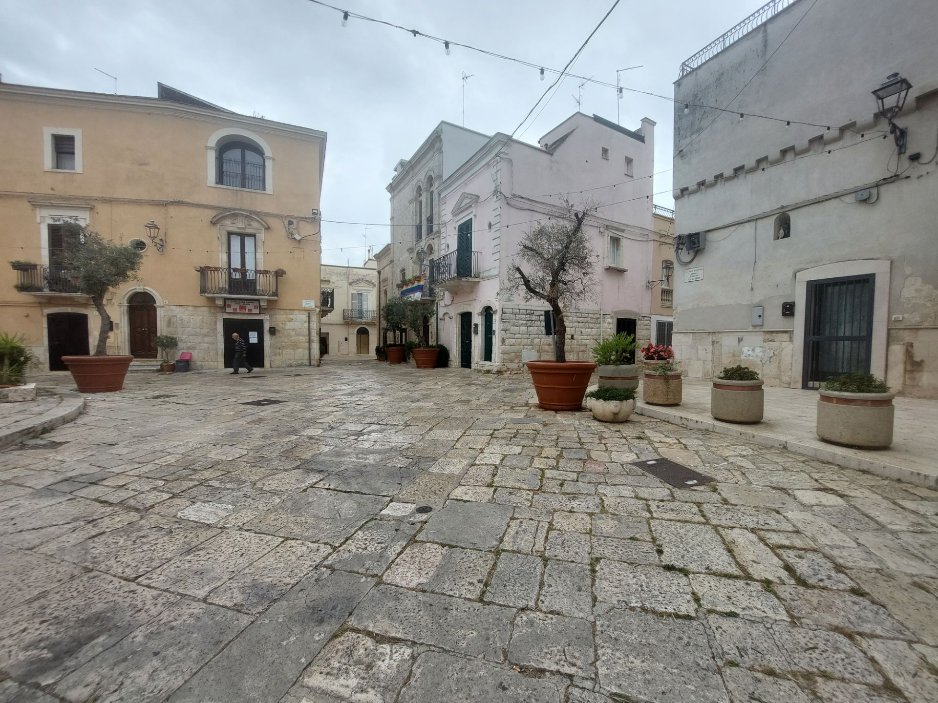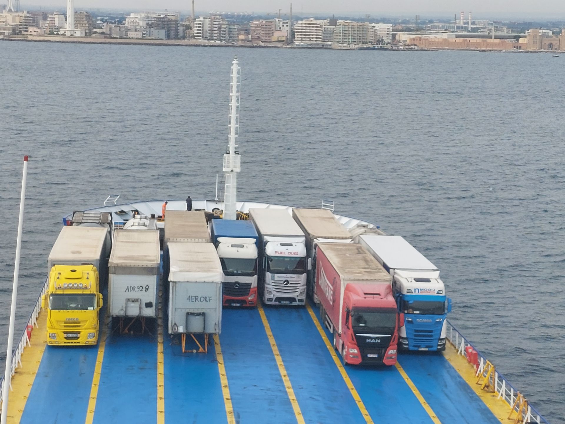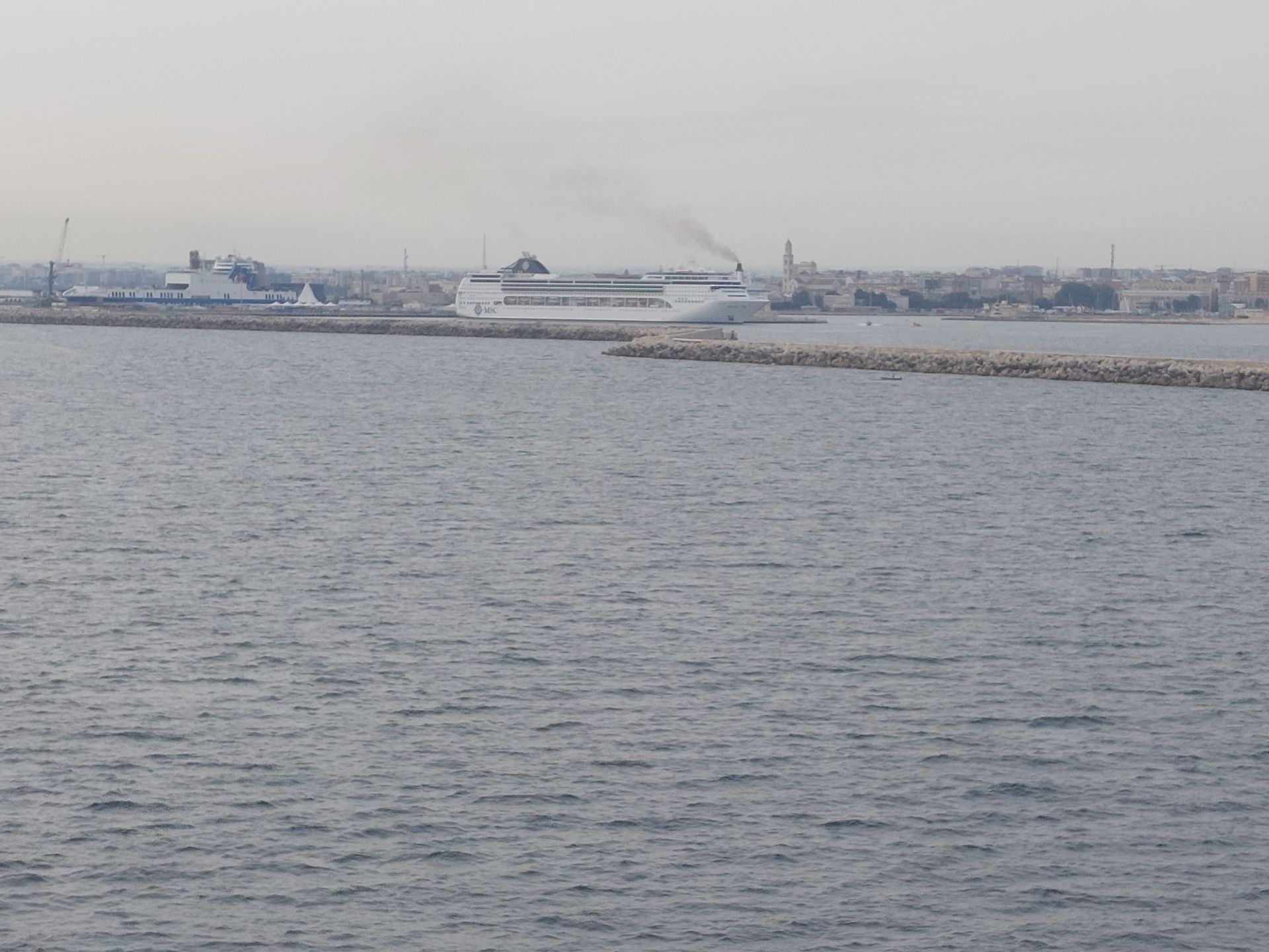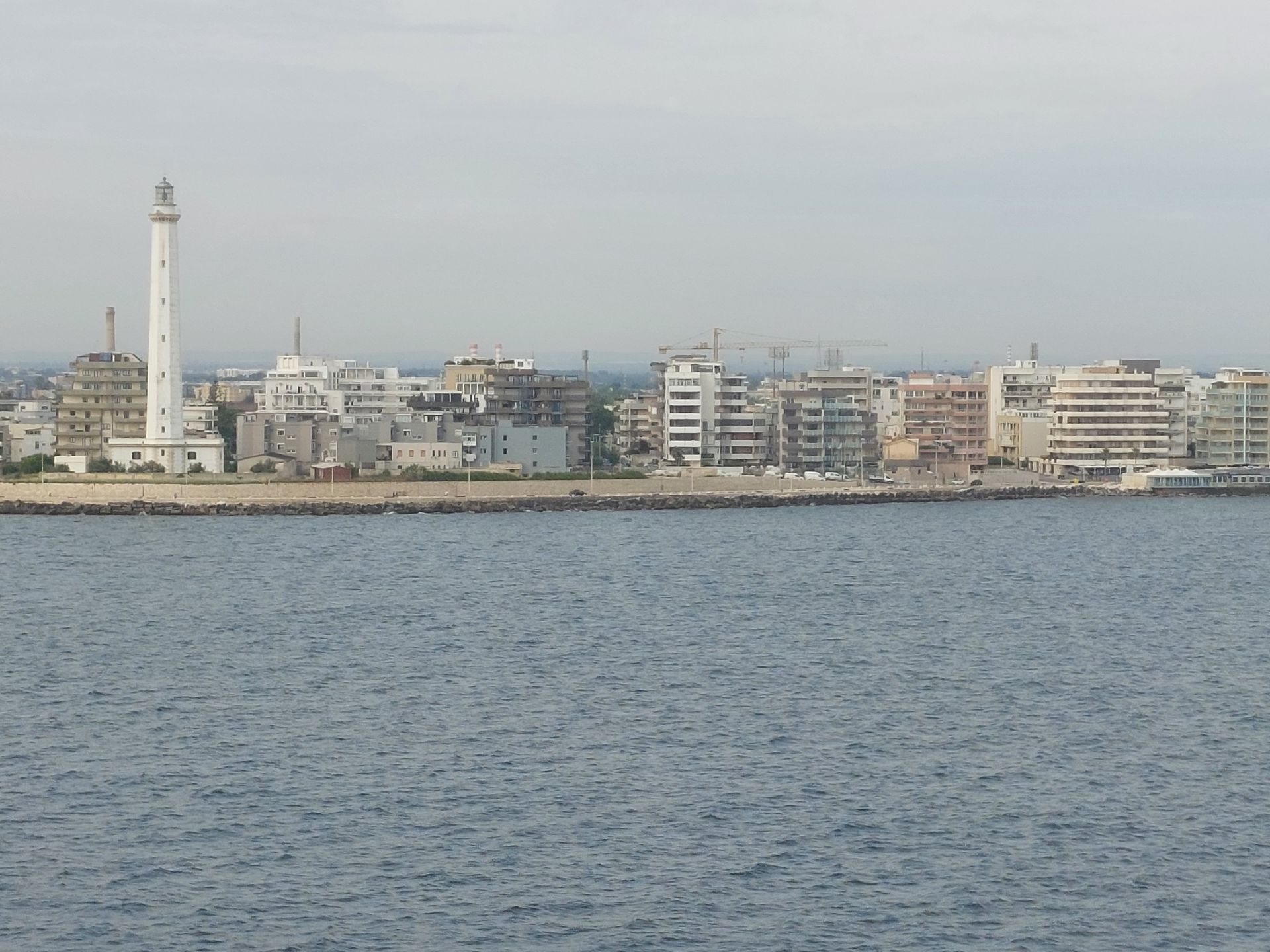 Retour en Italie après une nuit en mer, la chaleur est déjà bien présente sur le pont à 6h30 après le café national dans un dé à coudre, bon et fort, mais court pour moi. Depuis le pont supérieur, je suis le mouvement du ferry qui longe la côte pendant un long moment, se rapproche des paquebots de croisière, immeubles flottants à côté des immeubles du front de mer, puis attente d’accostage, tout le monde se masse dans les escaliers. On récupère les vélos, passage prioritaire à la douane pour les ressortissants européens, nous nous mêlons à la circulation de Bari, d’abord près des plages, puis nous entrons dans la ville, je retrouve avec plaisir cette atmosphère italienne, faite de douceur, sauf sur la route ! A Adelfia, halte sur une placette, des bancs nous tendent les accoudoirs près de la fontaine, les habitants viennent remplir les bidons d’eau fraîche, je fais de même. L’ocre des pierres se décline en différentes formes dans un mélange de constructions qui forment un ensemble harmonieux, des voix s’élèvent et se répondent dans la rue, depuis les fenêtres, les portes, musique d’ambiance. La pluie prévue faible s’annonce un peu plus pressante, c’est bientôt l’été, je refuse de mettre la cape … jusqu’à Acquaviva delle Fonti, je suis trempé, on s’abrite sous un porche et je mets des vêtements un peu plus chauds. Je patiente, repars mieux couvert, petit tour vers la cathédrale sur les conseils de Pierre, la pluie cesse. Nous nous retrouvons sur une petite route de campagne, champs entourés de murs en pierre sèche, balles de foin, quelques arbres, un vrai bonheur de cycliste. Arrivée à Laterza, la ville est déserte, peut-être l’heure de la sieste, nous nous arrêtons sous la halle, près du chateau, il semble que des festivités soient prévues car le centre sera bloqué ce soir indiquent des affiches, notre hébergement est à l’extérieur, nous n’en profiterons pas.