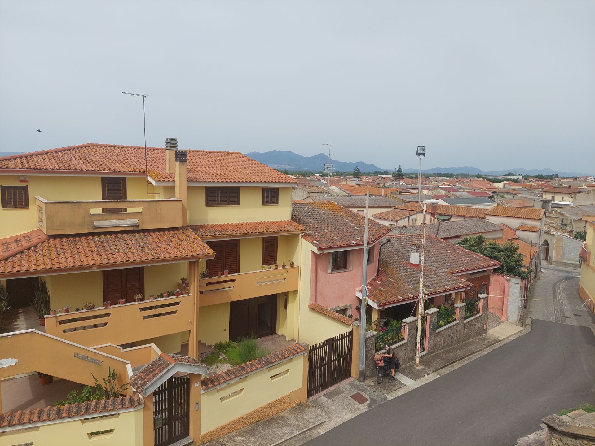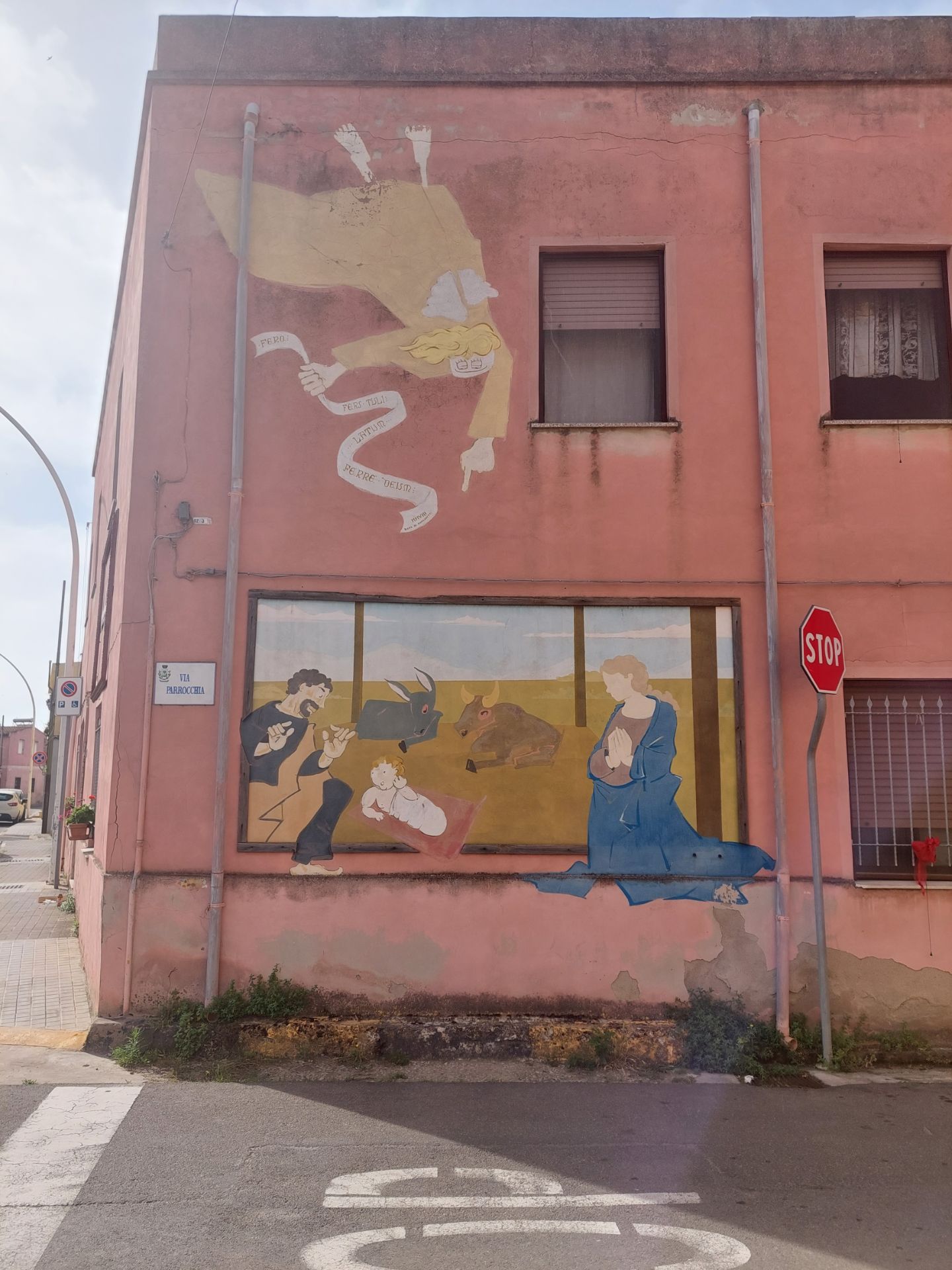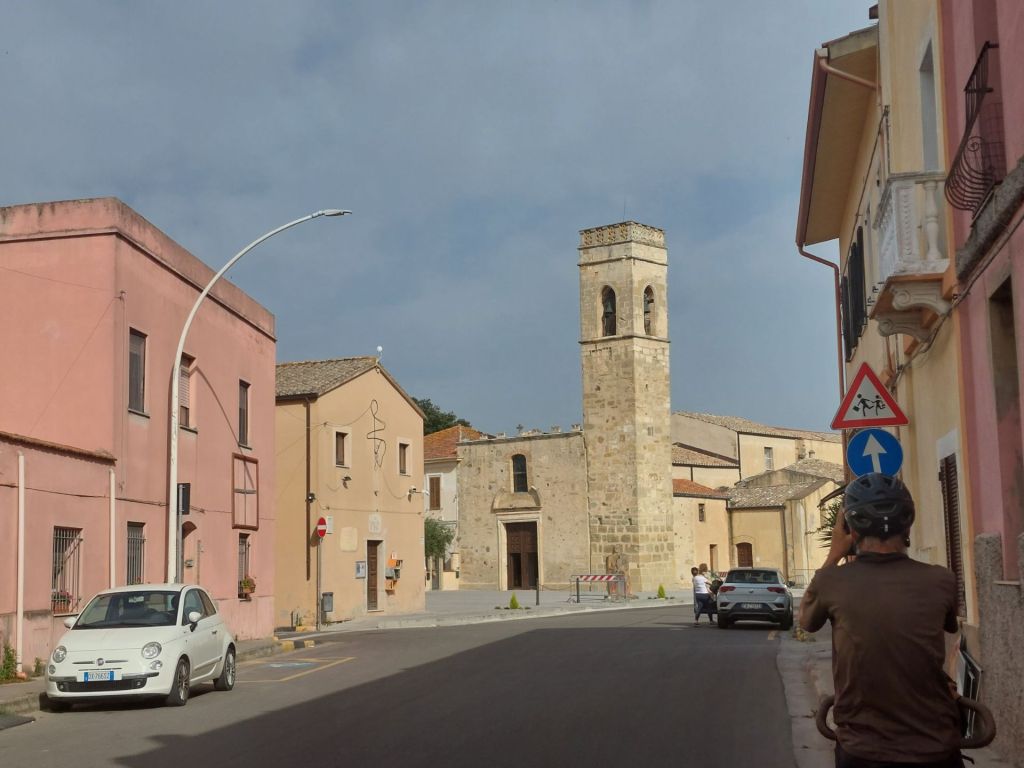 Bien que proche de la mer, ce n’est pas le tintement des drisses sur les mâts, mais celui des cordelettes d’échafaudage du chantier voisin battant au vent qui m’accueillent au réveil, le petit déjeuner sur la terrasse le confirme il y a du vent et bonne nouvelle, il sera favorable. Deux jours sans rouler, je reprends le vélo avec plaisir ce matin, un petit cliquetis m’a inquiété un moment, mais quelques gouttes de burette magique sur les roulements de pédales se sont chargées de rétablir le silence sur cette étape assez courte et sans relief. Premier arrêt à San Sperate, plusieurs fresques, scènes villageoises ou d’inspiration religieuse, ces peintures murales ont essaimé ensuite vers d’autres villes dit Wikipedia. Samassi, belle vue sur la ville depuis le promontoire de l’église, en partant nous empruntons la rue Sacco et Vanzetti, l’histoire de ces deux immigrés Italiens m’avait particulièrement marqué quand j’avais vu le film, un plaidoyer contre la peine de mort et les procès expéditifs, l’histoire bégaie quand Mohamed Ben Salmane, reçu en grande pompe en France, fait exécuter ses opposants. J’écoute avec émotion Joan Baez, très engagée dans la défense des droits civiques et humains chanter la version de « here’s to you Nicola and Bart » pour Amnesty. En Italie, nous avons croisé quelques vieux parlant un peu français, émigrés en France et revenus au pays, une pensée pour Cavanna qui a si bien décrit cette communauté dans son livre truculent les Ritals, qui était aussi un hommage à son père maçon illettré. Le vent nous pousse, Sanluri, pause restauration devant l’église, enfin plutôt une église, car ce pays n’en manque pas, à Sardara j’en dénombre quatre si j’en crois les panneaux qui nous invitent à les voir. Uras, ville déserte termine le trajet du jour, j’ai la sensation que ces communes se vident, certes les maisons se protègent du soleil derrièreles volets fermés, mais j’ai vu plusieurs pancartes « vendesi » et les commerces ouverts sont peu nombreux.