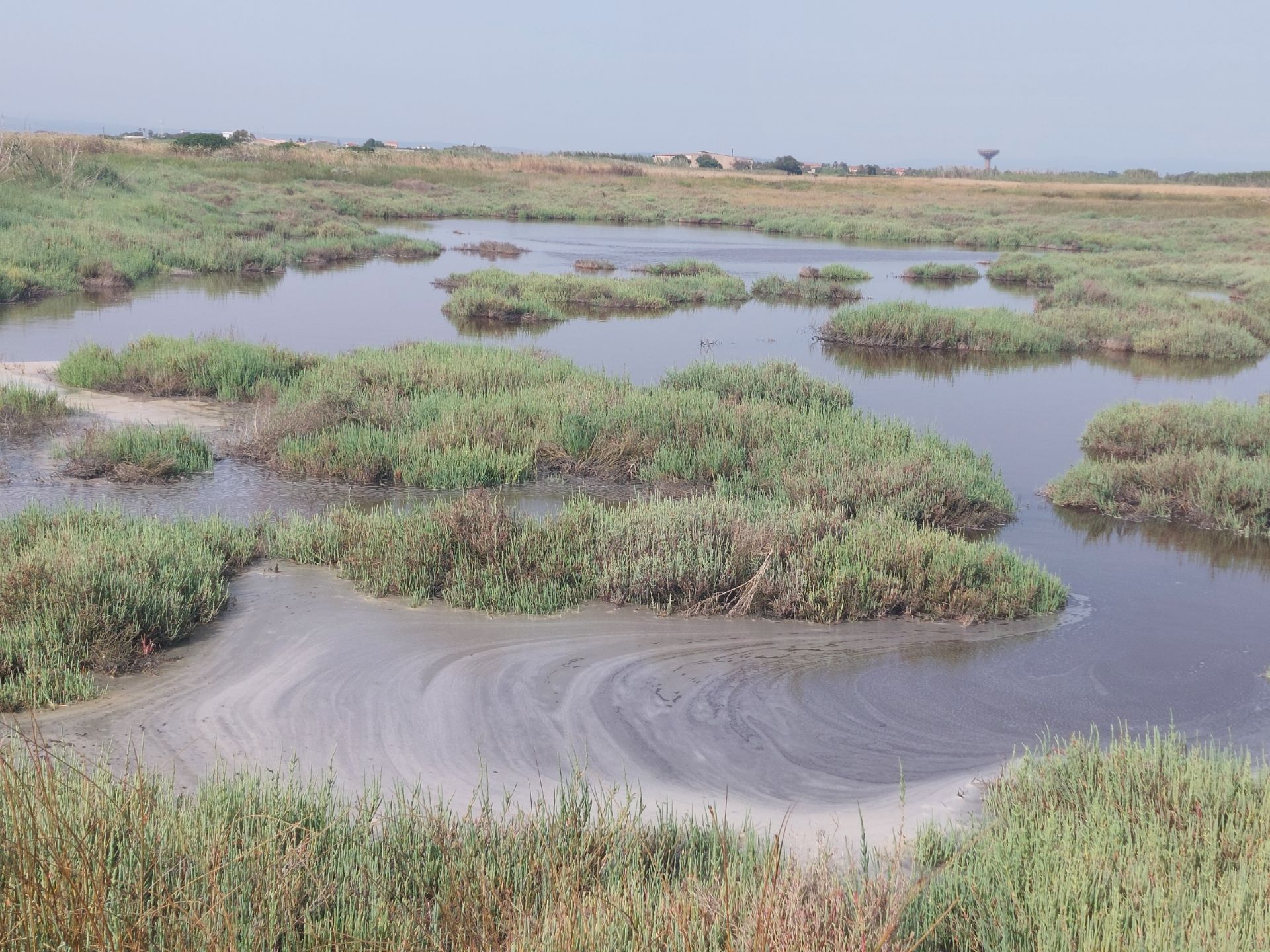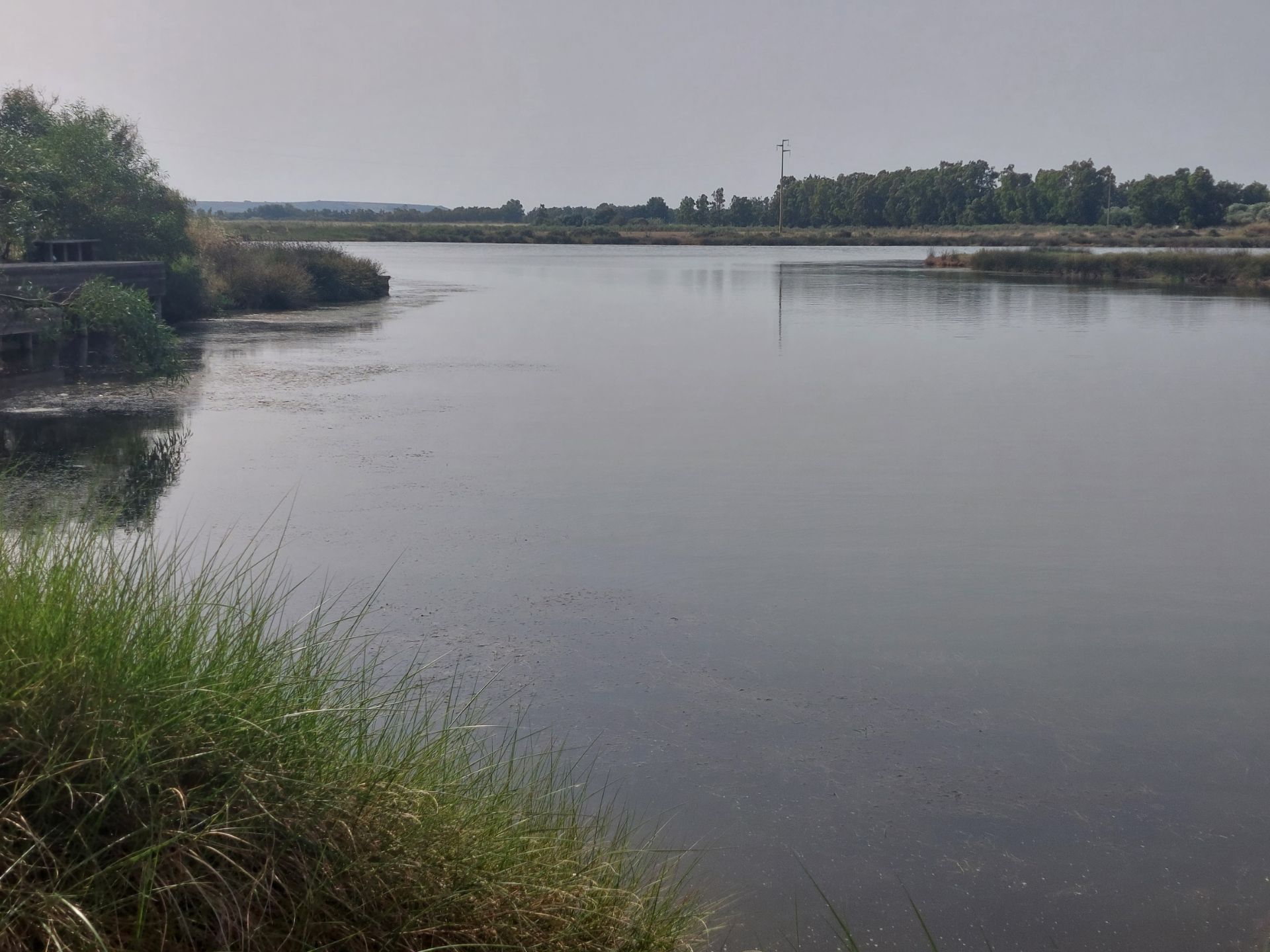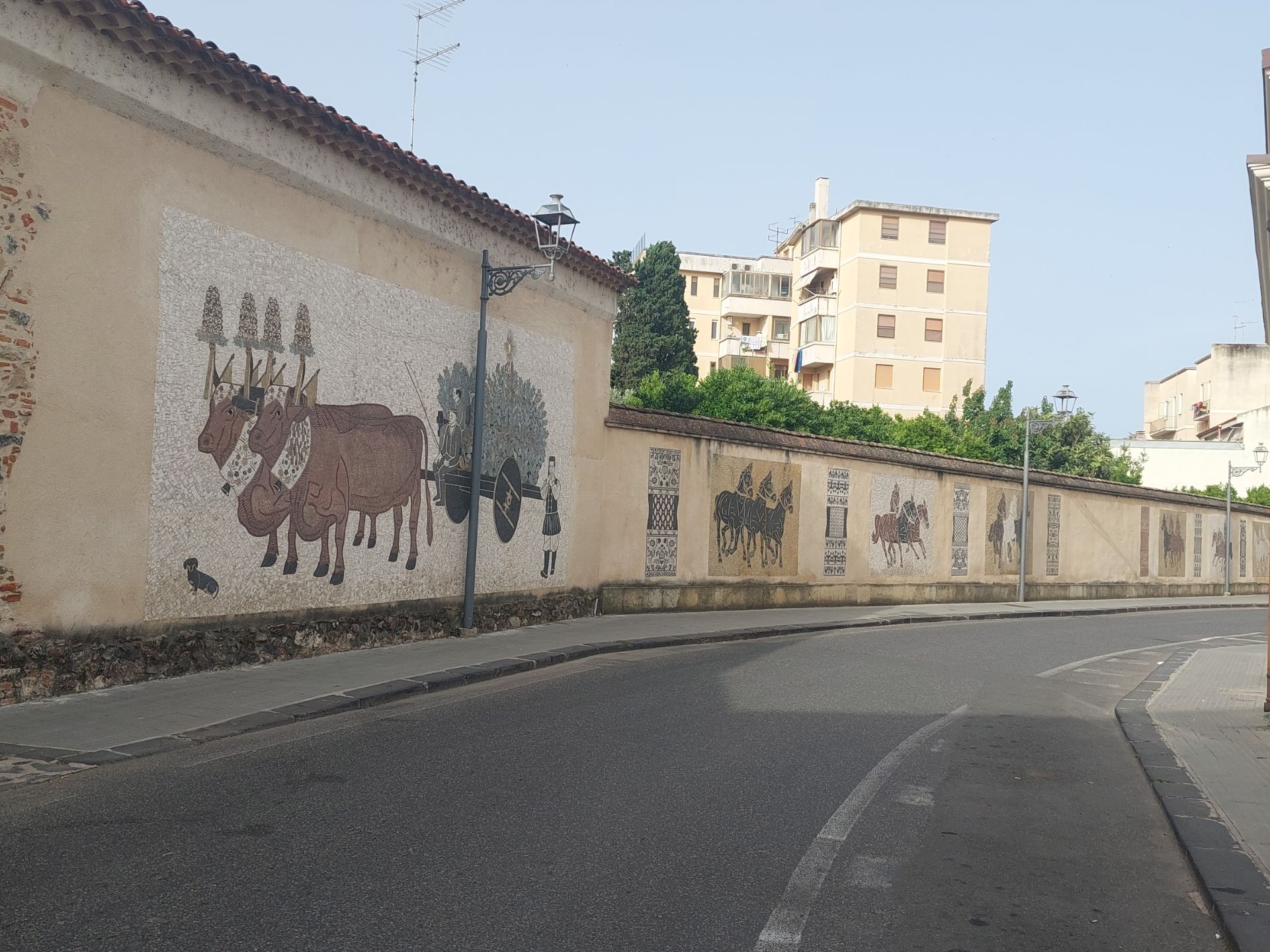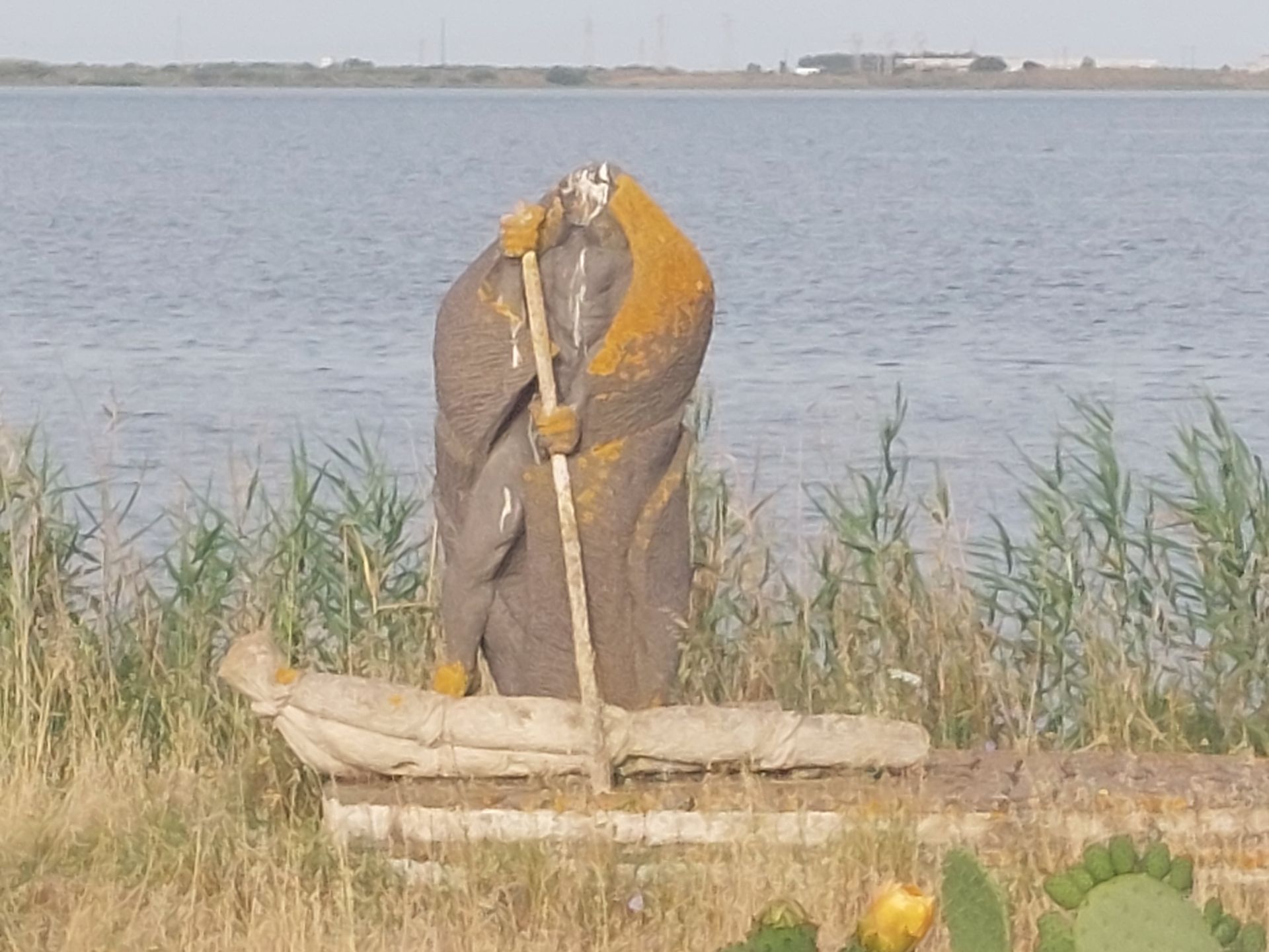 Refus d’obstacle ce matin devant les étapes prévues pour les quatre jours à venir, Pierre parcourt la montagne et la côte Est, pendant que je me réserve le bord de mer de la côte Ouest, avec trois fois moins de distance, ce qui a motivé le détour que je fais, nous nous retrouverons vendredi à Porto Torres pour le retour vers la France. Notre hôtesse a gentiment accepté de nous servir le petit-déjeuner à 6 heures et nous ne l’avons pas regretté, c’était fin et copieux, ce qui nous a permis de prendre la route au lever du soleil que nous avons vu apparaître, disque blanc, derrière les montagnes. Nous prenons d’abord le même itinéraire pour nous séparer vers Oristano ou dès que Pierre accélérera, nous longeons la nationale sur une contre allée qui doit être l’ancienne voie très peu fréquentée, nous entendons juste le trafic. Nous croisons un espace brûlé, l’incendie doit être récent, quelques fumées s’élèvent encore. Santa Giusta, grand lac, un curieux navigateur de pierre tente de le rejoindre depuis la rive, j’aperçois au loin un flamant rose, étonnamment seul. Avant de rejoindre le bord de mer, je voulais voit un exemplaire de nuraghe, tour typique de Sardaigne, j’en repère une sur la carte aune vingtaine de kilomètres de Orastino, juste avant la montagne, ce qui me va bien, malheureusement je ne verrai qu’un tas de pierres, tant pis, j’ai pu profiter d’une petite route agréable, de villages sympathiques, retour vers Orastino et je me dirige vers Torregrande, ville du bord de mer où j’ai réservé un hébergement. Promenade dans le parc archéologique du golfe phénicien, ce sont des lagunes qui avaient été utilisées en pêcheries, encore en service, en cours de réhabilitation. Retour par le bord de mer, la plage est en plein vent, ça rafraîchit un peu l’atmosphère.
