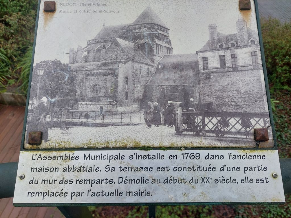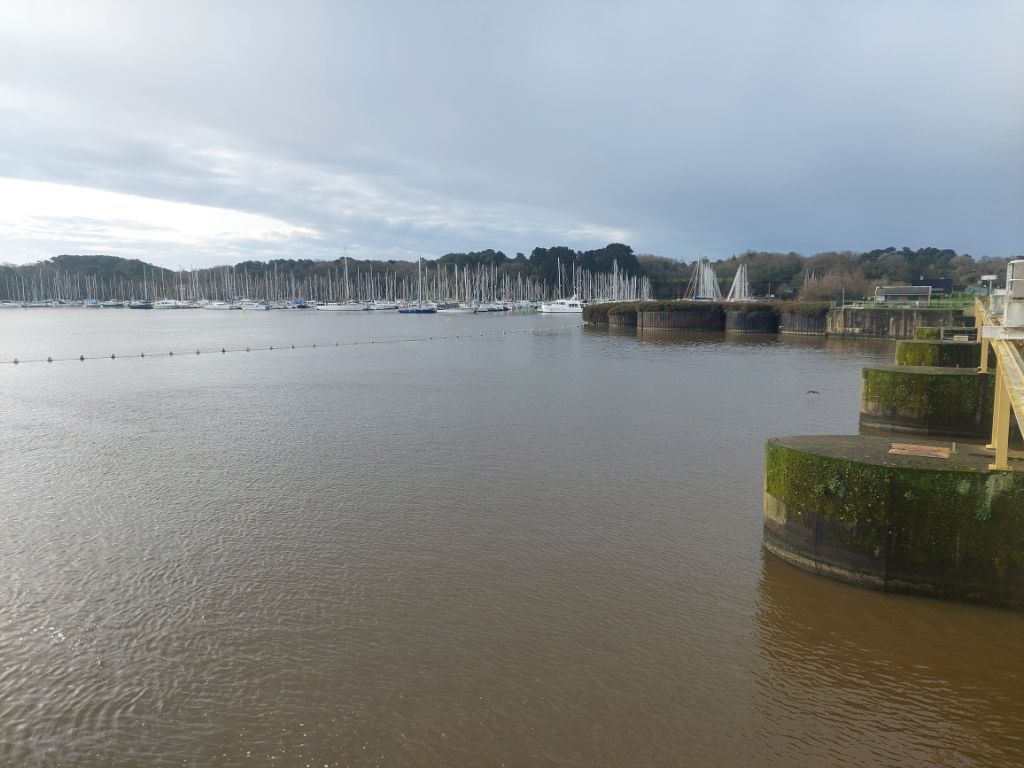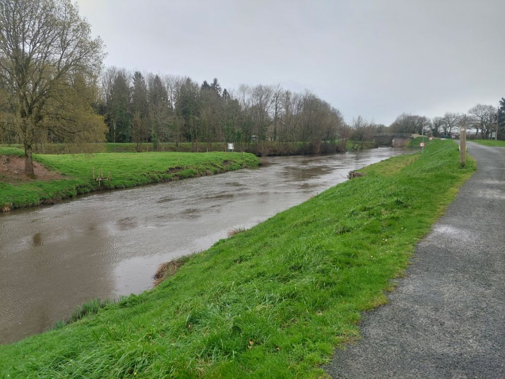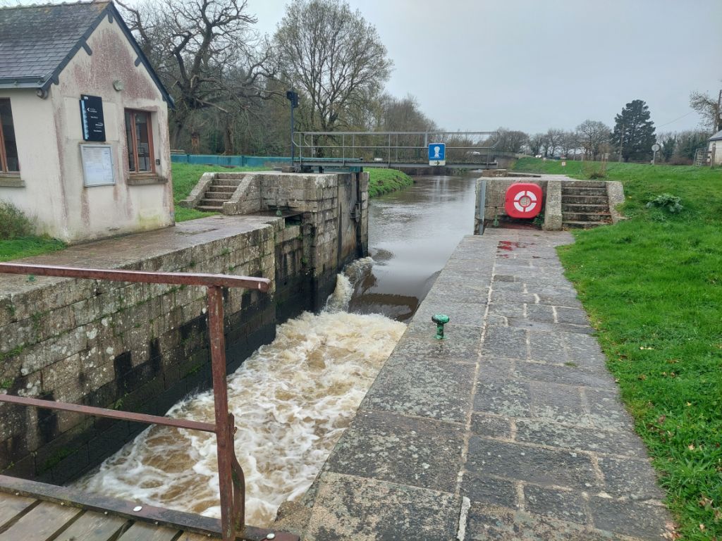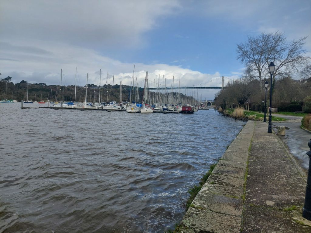 Quand on regarde la carte, le trajet est une assez courte étape le long de la Vilaine pour nous conduire jusqu’à Redon. Réveillé par un fort coup de vent puis par une grosse pluie, je me dis que la journée ne sera peut-être pas un long fleuve tranquille. La pluie ralentit puis cesse avant d’enfourcher nos montures elle aussi douchées, j’enfile par précaution les vêtements de pluie, le vent souffle, il nous est favorable c’est déjà ça et la pluie nous épargnera. Nous rejoignons rapidement les hauts de la Vilaine, puis c’est sous le soleil que nous l’admirons au petit port de Trehiguier, puis nous remontons sur les hauteurs pour ensuite descendre vers le barrage d’Arzal,. Arzal a été construit pour réguler le cours du fleuve, éviter les inondations et créer une réserve d’eau potable, dans le même temps il a permis le développement de la plaisance et en plus des ports bien occupés, nous verrons quelques terrains campings, la mer n’est pas si loin. Pendant une partie de la journée nous ferons des allers et retours entre le haut du versant et la vallée, monter puis descendre et recommencer. Nous suivons la véloroute bien balisée comme hier sur des revêtements stabilisés passant par des paysages arborés ou bocagés, à peine quelques passages boueux et humides, j’apprécie. Depuis les hauteurs de la Roche Bernard, « l’ancien » viaduc, souvent aperçu depuis la route nationale, étire ses deux pylônes blancs vers les nuages, les bords du fleuve sont beaucoup moins animés qu’en juin 2020, quand j’avais fait une échappée post confinement, les quais sont seulement parcourus par un vent glacial qui nous invite à chercher dans la ville haute un abri, ce sera une terrasse de café après la courte mais rude montée aux côtés de nos vélos. Petite collation, ainsi ragaillardis nous reprenons la route, on se rapproche de la vaste plaine de la Vilaine, moins de relief pour rapidement atteindre les marais, nous appréhendons un peu, mais aucune inondation ne vient couper notre chemin même si comme partout l’eau remplit fossés, ruisseaux et détrempe la terre des champs, passablement immergées les cultures souffrent. Quelques kilomètres avant Redon, écluse des Bellions, le canal de Nantes à Brest rejoint la Vilaine et je découvre que ledit canal se jette deux fois dans la Vilaine, une fois aux Bellions donc et plus loin à Saint Nicolas de Redon après un chenal latéral que nous suivrons pour terminer notre étape, la raison est la marée qui avant la création du barrage d’Arzal ne permettait pas de rejoindre le fleuve selon la hauteur de l’eau. A Redon, l’abbatiale est en travaux et inaccessible, nous voyons juste son clocher séparé de l’église par le bâtiment de la mairie, religion et administration cohabitent depuis longtemps en Bretagne.