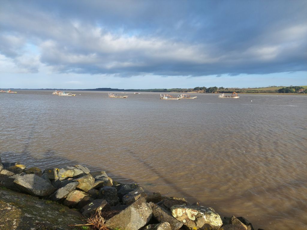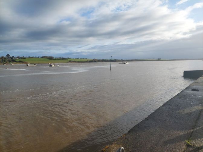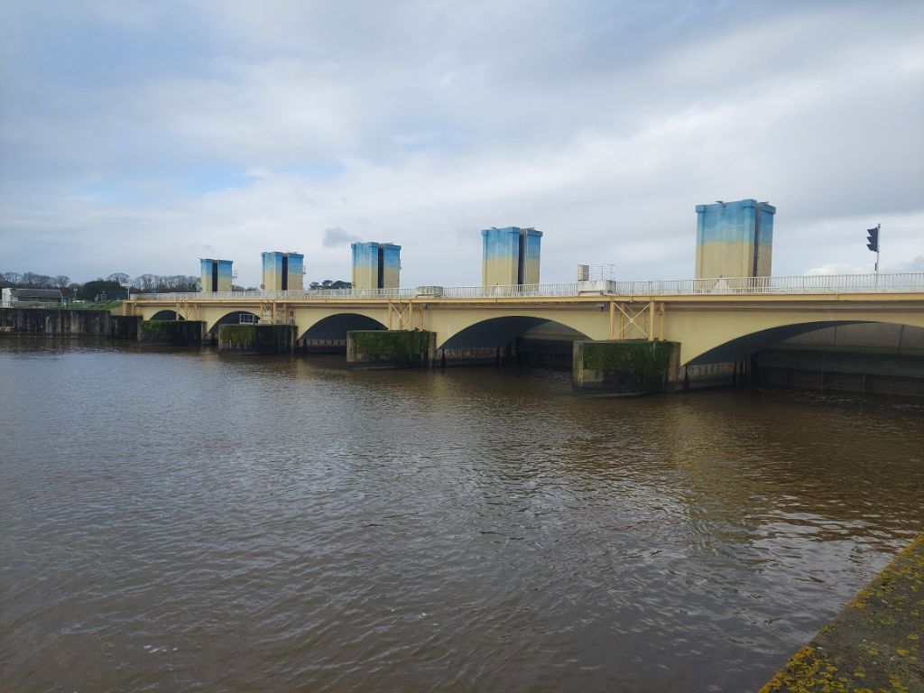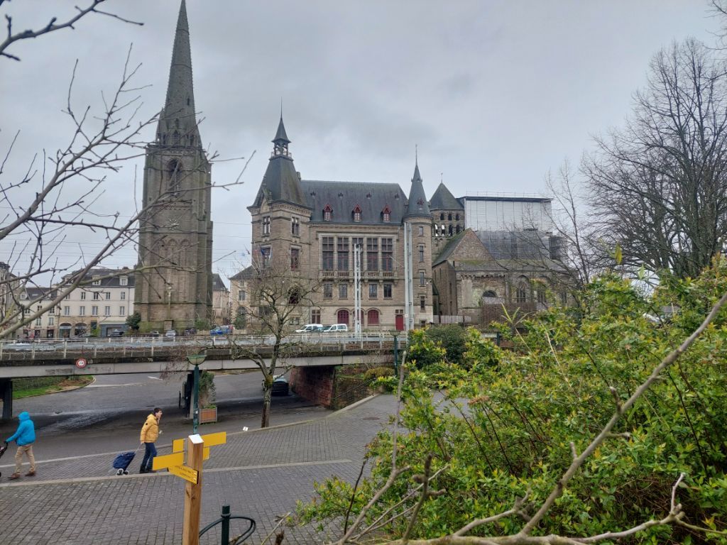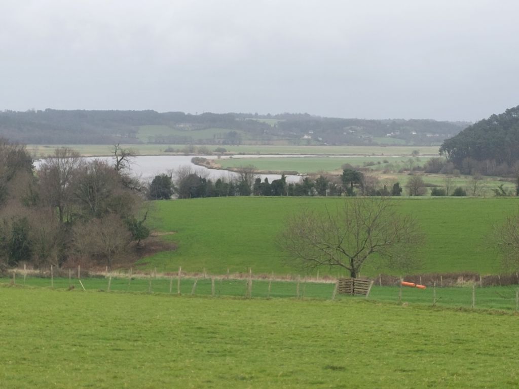 Quand on regarde la carte, le trajet est une assez courte étape le long de la Vilaine pour nous conduire jusqu’à Redon. Réveillé par un fort coup de vent puis par une grosse pluie, je me dis que la journée ne sera peut-être pas un long fleuve tranquille. La pluie ralentit puis cesse avant d’enfourcher nos montures elle aussi douchées, j’enfile par précaution les vêtements de pluie, le vent souffle, il nous est favorable c’est déjà ça et la pluie nous épargnera. Nous rejoignons rapidement les hauts de la Vilaine, puis c’est sous le soleil que nous l’admirons au petit port de Trehiguier, puis nous remontons sur les hauteurs pour ensuite descendre vers le barrage d’Arzal,. Arzal a été construit pour réguler le cours du fleuve, éviter les inondations et créer une réserve d’eau potable, dans le même temps il a permis le développement de la plaisance et en plus des ports bien occupés, nous verrons quelques terrains campings, la mer n’est pas si loin. Pendant une partie de la journée nous ferons des allers et retours entre le haut du versant et la vallée, monter puis descendre et recommencer. Nous suivons la véloroute bien balisée comme hier sur des revêtements stabilisés passant par des paysages arborés ou bocagés, à peine quelques passages boueux et humides, j’apprécie. Depuis les hauteurs de la Roche Bernard, « l’ancien » viaduc, souvent aperçu depuis la route nationale, étire ses deux pylônes blancs vers les nuages, les bords du fleuve sont beaucoup moins animés qu’en juin 2020, quand j’avais fait une échappée post confinement, les quais sont seulement parcourus par un vent glacial qui nous invite à chercher dans la ville haute un abri, ce sera une terrasse de café après la courte mais rude montée aux côtés de nos vélos. Petite collation, ainsi ragaillardis nous reprenons la route, on se rapproche de la vaste plaine de la Vilaine, moins de relief pour rapidement atteindre les marais, nous appréhendons un peu, mais aucune inondation ne vient couper notre chemin même si comme partout l’eau remplit fossés, ruisseaux et détrempe la terre des champs, passablement immergées les cultures souffrent. Quelques kilomètres avant Redon, écluse des Bellions, le canal de Nantes à Brest rejoint la Vilaine et je découvre que ledit canal se jette deux fois dans la Vilaine, une fois aux Bellions donc et plus loin à Saint Nicolas de Redon après un chenal latéral que nous suivrons pour terminer notre étape, la raison est la marée qui avant la création du barrage d’Arzal ne permettait pas de rejoindre le fleuve selon la hauteur de l’eau. A Redon, l’abbatiale est en travaux et inaccessible, nous voyons juste son clocher séparé de l’église par le bâtiment de la mairie, religion et administration cohabitent depuis longtemps en Bretagne.
