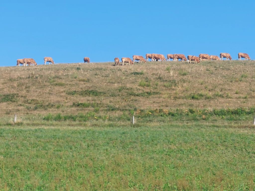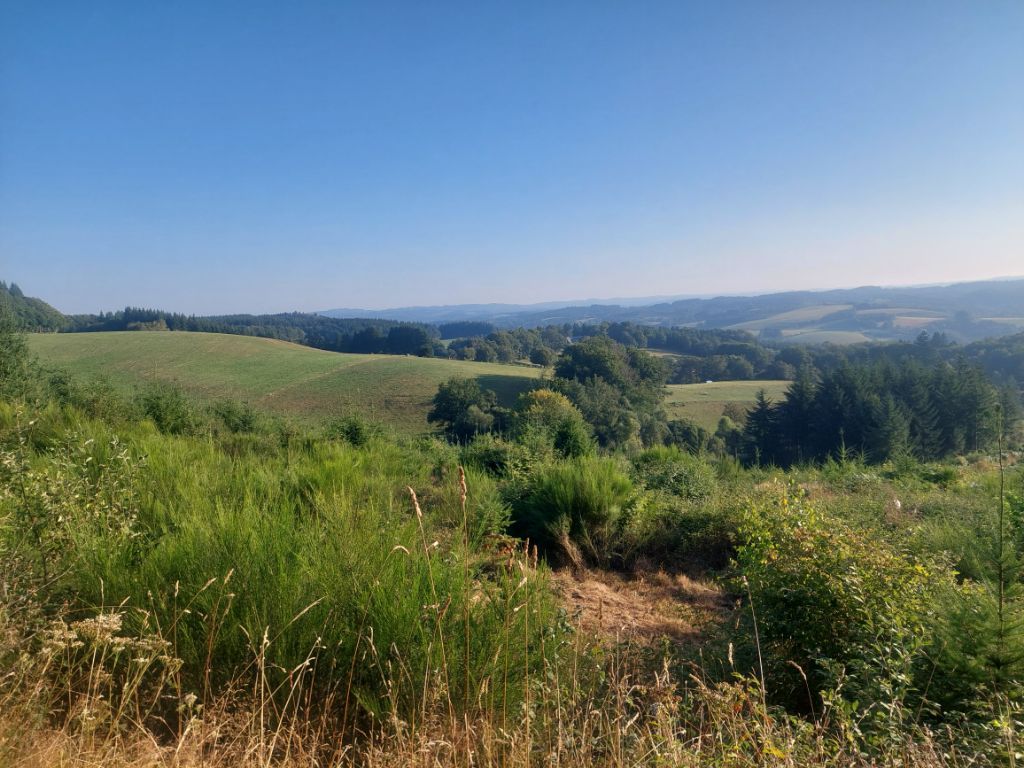 Parti tôt, j’avais un peu forcé la main à mes hôtes pour que je puisse prendre le petit-déjeuner à 7 heures et sur la route je ne tarde pas à quitter le coupe-vent, il fait déjà chaud dans la montée, il est étonnant de voir qu’il y a des Îlots de chaleur et de fraîcheur, un inexplicable car je ne croise ni vallée ni ruisseau. Le profil de la route indique une première montée jusqu’à 850 mètres d’altitude, puis descente graduelle vers 450 mètres, il aura donc quelques courtes mais parfois raides montées, dont la dernière qui m’amène à mon hébergement excentré du trajet. L’ascension vers le point culminant est agréable, de belles rangées de hêtres jalonnent la route, le pin est néanmoins majoritaire, je me demande quelle était la physionomie de la région avant les plantations de pins que ces terrains en pente. Je fais un petit détour par Lestards, qui me promet un église recouverte de chaume en paille de seigle, devant je m’aperçois que j’y suis passé l’an dernier, comme j’ai aussi parcouru une bonne partie du trajet dans l’autre sens, venant du Puy Mary. Le paysage change imperceptiblement, je ne saurai le définir est-ce les routes plus larges, les champs cultivés un peu plus nombreux, les villages un peu mieux fournis ou tout simplement le soleil légèrement brumeux qui change l’atmosphère. Je passe dans le massif des Monnedières, siège des meilleurs accordéonistes me dit-on à Chaumeil. Je traverse la rivière Corrèze (qui grossit les flots de la Vézère), encore une côte bien sûr pour s’élever. De temps en temps un bouffée d’odeur chaude de pins (je crois) me titille les narines, c’est légèrement sucré et assez fugitif.